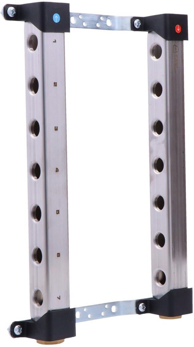 Rozdzielacz InoxFlow bez osprzętu (seria RBB) - 7 obwodów KAN-therm Rozdzielacz InoxFlow bez osprzętu (seria RBB) - 2-12 obwodów. Belka ze stali nierdzewnej 1.4301 (AISI) 3040 o profilu 11/4" z rozstawek belek 235mm. Belki (zasilająca i powrotna) z przyłączami instalacyjnymi na GW1", otworami GW 1/2" jako wyjścia na poszczególne obwody z rozstawem 50mm i obejmami wyposazonymi we wkładki elastometrowe tłumiące drgania. Otwór 1/2" w górnej części belek pod odpowietrznik. Belka zasilająca i powrotna z jednej strony z zaslepkami G1" Kod producenta: CKM914 Indeks producenta: 1316156005