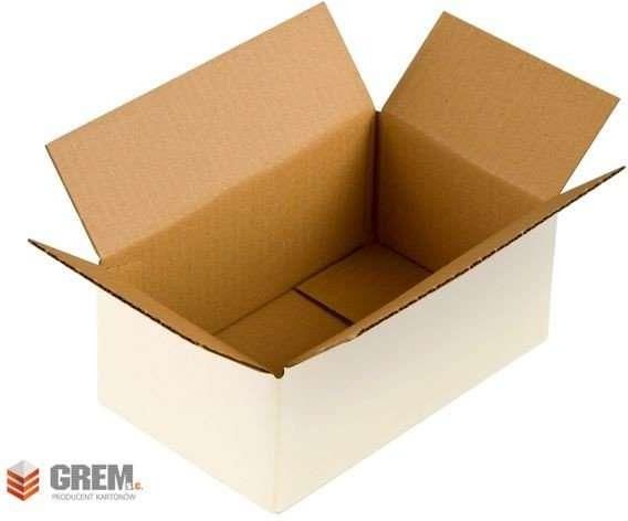 Paczka 600 sztuk białych pudeł kartonowych klapowych o wymiarach zew. 200x120x60 mm (dł/szer/wys). Opakowania wykonane są z trzywarstwowej tektury falistej (fala B) o gramaturze 365 g/m2.