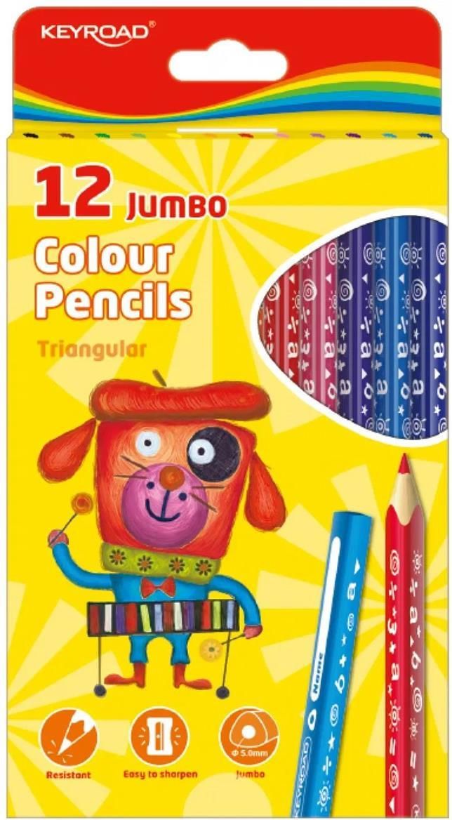 KREDKI OŁÓWKOWE KEYROAD JUMBO, TRÓJKĄTNY KSZTAŁT, 12 KOLORÓWtrójkątne kredki jumboidealne do kolorowanekmiękki grafitłatwe w temperowaniu12 kolorów w j.s.eurozawieszkakolor: mix kolorówOPIS MARKI KEYROAD: Marka Keyroad powstała w 2008 roku jest obecnie dostępna w ponad 150 krajach na całym świecie. Jej szeroka oferta produktowa skierowana jest przede wszystkim do dzieci w wieku przedszkolnym i szkolnym. Każde dziecko - młodsze, starsze - jest artystą, które bezgranicznie wierzy w swoje możliwości. Chcąc rozwijać twórcze pasje najmłodszych, pod marką Keyroad nieustannie wprowadzamy nowe artykuły, które odznaczają się wysoką jakością, szeroką gamą kolorystyczną oraz wzornictwem dopasowanym do każdej kategorii wiekowej dziecka. W ofercie marki Keyroad można znaleźć m. in.: kredki, ołówki, niełamliwe zestawy geometryczne, cyrkle, długopisy, pióra, temperówki, gumki, kleje, zszywacze i wiele innych.