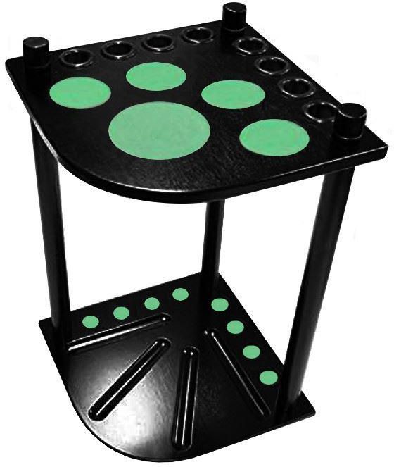 Stojak narożny 8 kijów kolor: czarny Stojak narożny na 8 kijów, to jeden z najbardziej funkcjonalnych i praktycznych stojaków.Mimo niewielkich wymiarów zajmuje stosunkowo mało miejsca, a dodatkowo może służyć jako stolik, a także możemy trzymać na nim bile.Na górnej półce mamy 5 wklejonych podkładek, które mogą służyć np. pod 4 szklanki i karafkę.Na dolnej możemy ułożyć komplet bil. Wymiary:- wysokość 54,5 cm- szerokość 35,5 cm Zdjęcie poglądowe - odcień i detale produktu mogą się różnić w zależności od partii. [[en]]{{Corner cue rack 8-holes oak}}