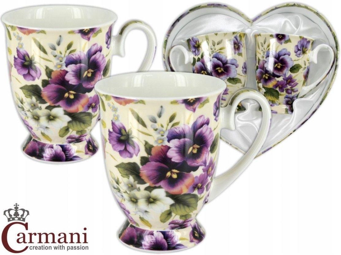 Carmani, 2 kubki z porcelany w opak.-sercu - BRATKI CARMANI - Nowa Zelandia/Chiny/Polska Dla pary kochającej naturę, florę... komplet Bratki składający się z dwóch, identycznych kubków(np.: dla dwojga) o oryginalnym, intensywnym i wyraźnym kolorystycznie motywem naniesionym na powierzchni. Komplet …