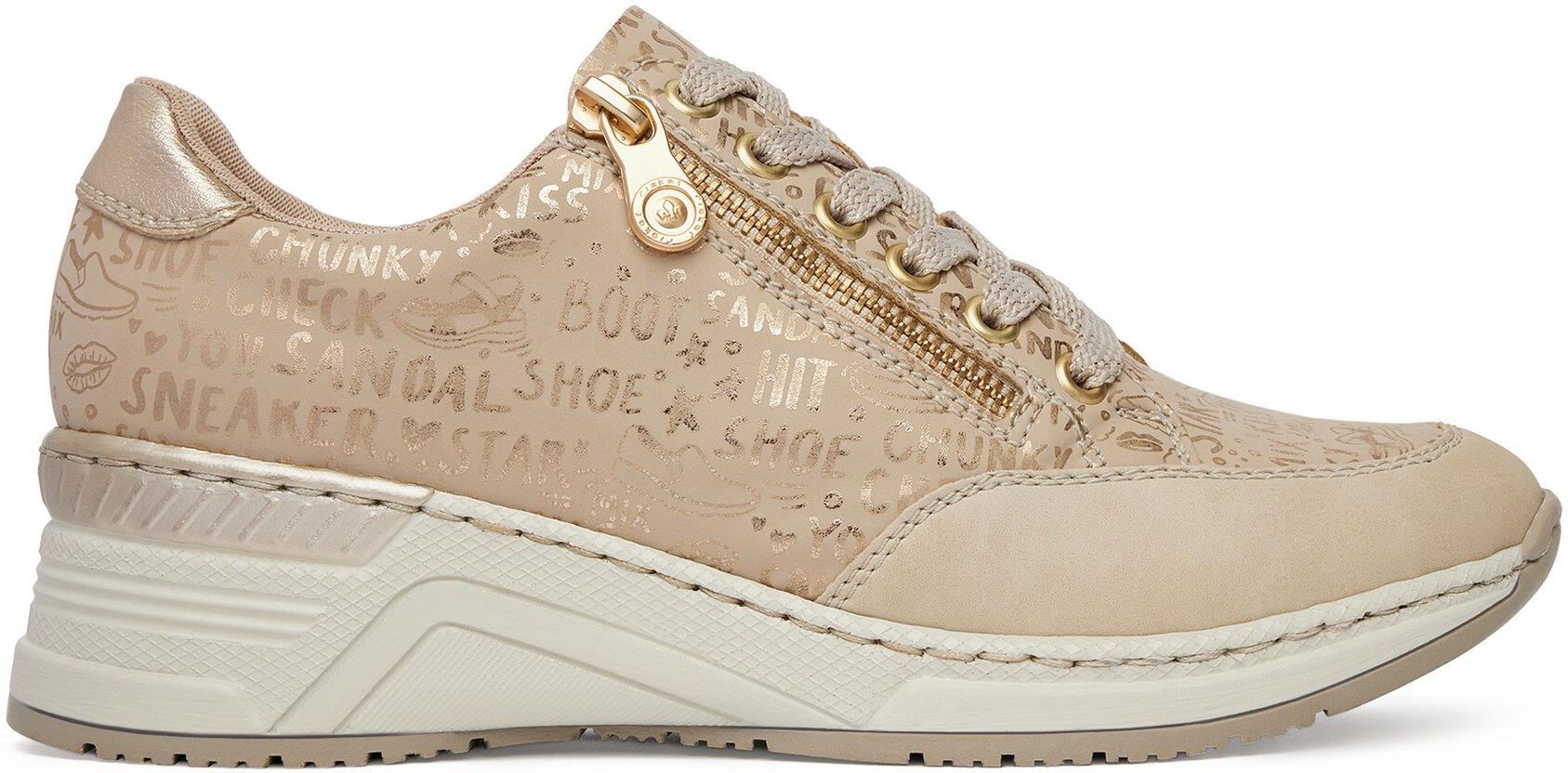 Damskie sneakersy Rieker w beżowym kolorze to idealne połączenie stylu i funkcjonalności. Wykonane z wysokogatunkowego tworzywa syntetycznego, gwarantują trwałość i komfort noszenia na co dzień. Beżowa cholewka sprawia, że buty są uniwersalne i łatwe do zestawienia z różnymi stylizacjami, zarówno sportowymi, jak i casualowymi. Dzięki zastosowaniu nowoczesnych technologii, sneakersy Rieker to doskonały wybór dla kobiet, ceniących wygodę oraz modny wygląd. Idealne na każdą okazję, od codziennych spacerów po aktywne dni w mieście. Od ponad stu lat marka Rieker oferuje niezwykle komfortowe i trwałe obuwie, które powstaje z myślą o zdrowiu stóp. Dzięki wieloletniemu doświadczeniu w produkcji obuwia, ta niemiecka marka doskonale potrafi łączyć wygodę ze stylem, dlatego w ofercie znajdziesz buty w modnych, oryginalnych fasonach, które każdemu przypadną do gustu. Buty Rieker tworzone są z materiałów wysokiej jakości, przez co odznaczają się wyjątkową elastycznością i trwałością, ale też lekkością. Ponadto w obuwiu stosuje się szerszą formę zapewniającą odpowiednią stabilizację stopy, specjalne podeszwy absorbujące wstrząsy oraz odciążające stawy i kręgosłup, a także wyjmowane wkładki z pianki Memory Foam, która idealnie dopasowuje się do kształtu stóp. To doskonałe produkty dla tych, którzy ponad wszystko cenią sobie komfort. Przekonaj się!