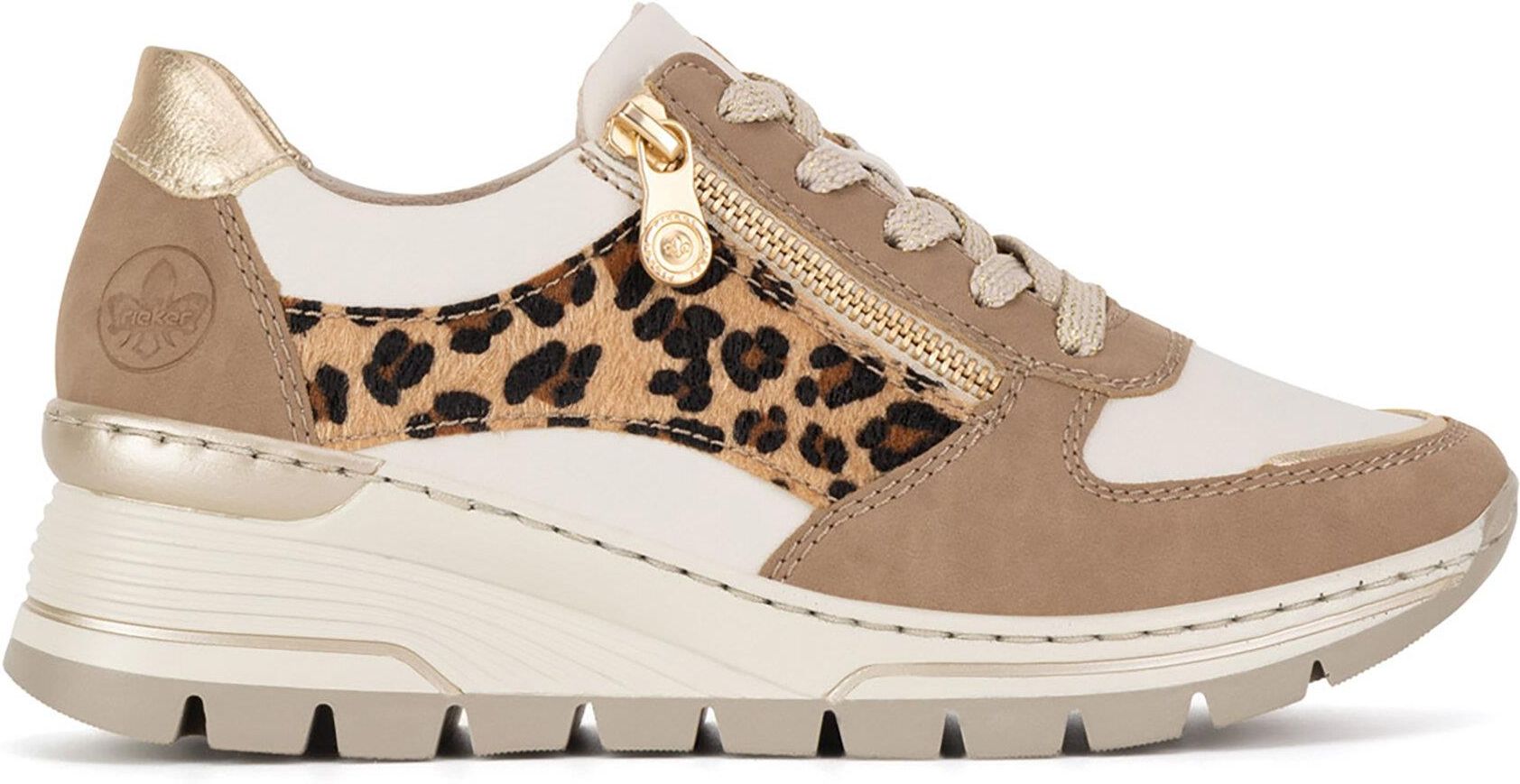 Sneakersy damskie Rieker w ciemnobeżowym kolorze to idealny wybór dla kobiet, które cenią styl, komfort i funkcjonalność. Wykonane z wysokogatunkowego tworzywa syntetycznego, gwarantują trwałość i wygodę użytkowania. Ich suwak umożliwia szybkie zakładanie, a koturnowy obcas dodaje kobiecego wdzięku, jednocześnie zapewniając komfort przez cały dzień. Okrągły nosek sneakersów Rieker daje swobodę palcom, co jest nieocenione podczas codziennych aktywności. To obuwie, które doskonale sprawdzi się w każdej sytuacji, łącząc praktyczność z nowoczesnym designem. Musisz je mieć! Od ponad stu lat marka Rieker oferuje niezwykle komfortowe i trwałe obuwie, które powstaje z myślą o zdrowiu stóp. Dzięki wieloletniemu doświadczeniu w produkcji obuwia, ta niemiecka marka doskonale potrafi łączyć wygodę ze stylem, dlatego w ofercie znajdziesz buty w modnych, oryginalnych fasonach, które każdemu przypadną do gustu. Buty Rieker tworzone są z materiałów wysokiej jakości, przez co odznaczają się wyjątkową elastycznością i trwałością, ale też lekkością. Ponadto w obuwiu stosuje się szerszą formę zapewniającą odpowiednią stabilizację stopy, specjalne podeszwy absorbujące wstrząsy oraz odciążające stawy i kręgosłup, a także wyjmowane wkładki z pianki Memory Foam, która idealnie dopasowuje się do kształtu stóp. To doskonałe produkty dla tych, którzy ponad wszystko cenią sobie komfort. Przekonaj się!