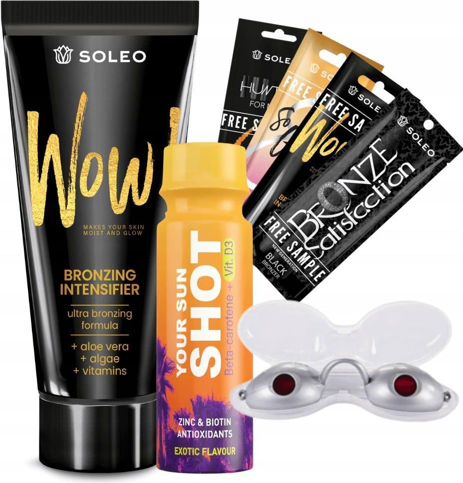 Soleo Wow 150ml Utra Bronzer Do Opalania + GratisyAroma TrendZESTAW ZAWIERA:1x tuba 150ml CHIC przyspieszacz z drobinkami1x Your Sun Shot1x okularki do opalania w solarium (kolor: silver lub gold)4x mix próbek SoleoBRONZER WOW!MOCNY BRONZERZ WITAMINAMI I ALOESEMSkładniki aktywne:DHA, wyciąg z orzecha włoskiego, tyrozyna, aloes, algi, witaminy: B6, B3, B2Zapach: tropical fruitBronzer Soleo Wow! rekomendowany dla: osób, które opalają się regularnie i utrzymują opaleniznę na wysokim poziomie.Sposób użycia:Bezpośrednio przed opalaniem nanieś równomierną warstwę na całą powierzchnię ciała. Po aplikacji, umyj dokładnie ręce! Pamiętaj, że produkt przeznaczony jest wyłącznie do użytku zewnętrznego. Aby skutecznie wzmacniać i zachować na opaleniznę dłużej używaj każdorazowo przed wizytą w solarium.DHA, wyciąg z orzecha włoskiegotyrozynaaloesalgiwitaminy: B6, B3, B2Ingredients (INCI):Aqua, Aloe Barbadensis Leaf Juice, Capric/Caprylic Triglycerides,, Dimethicone, Cetearyl Alcohol, Dihydroxyacetone, Glyceryl Stearate, Peg-100 Stearate, Glycerin, Parfum, Polysorbate 60, Caramel, Juglans cinerea Extract, Hedera Helix Extract, Tea-Hydroiodide, Sodium PCA, Phenoxyethanol, Ethylhexylglycerin, Tocopheryl Acetate, Tyrosine, Soluble Collagen, Adenosine Triphosphate, Palmaria Palmata Extract, Betula Alba Bark Extract, Riboflavin, Beta-Carotene, Butyrospermum Parkii Butter, Lecithin, Laminaria Ochroleuca Extract, Laminaria Digitata Powder, Coleus Forskohlii Extract, Thermus Thermophillus Ferment, Citrus Sinensis peel Oil, Chlorella Vulgaris Powder, Melanin, Aspalathus Linearis Extract, Pinus Strobus Bark Extract, Palmitoyl Tripeptide-5, Xanthan Gum, Tripeptide-1, Ruscus Aculeatus Root Extract, Maltodextrin, Propylene Glycol, Silica, Carnitine, Escin, Lawsonia Inermis Extract, Juglans Regia Shell Extract, Ammonium Acryloyldimethyltaurate/VP Copolymer, Caprylyl Glycol, Niacinamide, Helianthus Annuus Seed Extract, Foeniculum Vulgare Fruit Extract, Vitis Vinifera Seed Extract, Glucosamine, Pyridoxine HCl, Copper Gluconate, Uracil, Menthyl Lactate, Yeast Extract, Manganese Chloride, Dextran, Acetyl hexapeptide-8 , Ectoin, Superoxide Dismutase, Caffeine, Linalool, Citronellol. YOUR SUN SHOTKarotenowy multidrink z wit.D wzmacniający efekt opalaniaSpragnieni słońca? Weź łyk Your Sun Shot, poczuj smak wakacji i ciesz się zachwycającą opalenizną przez cały rok. Zmotywuj skórę do działania!Your Sun Shot w formie ekspresowego drinka wspiera kondycję skóry oraz uzyskanie olśniewającej opalenizny podczas sesji opalania. Stymuluje tworzenie się brązowego pigmentu w skórze, odmładza i rozświetla oraz chroni cerę przed wolnymi rodnikami.Zatroszcz się o zdrowy wygląd i dobrą kondycję skóry od środka. Starannie dobrana kompozycja składników aktywnych Your Sun Shot skutecznie wpływa na efektywność opalania oraz utrzymanie organizmu w prawidłowej formie. Tworzenie się melaniny w skórze będzie przebiegać szybciej, a uzyskany kolor opalenizny będzie miał głębszy odcień i ładniejszy look!Najlepsze efekty uzyskasz łącząc drink Your Sun Shot z ulubionym kosmetykiem do opalania. Wypij porcję Your Sun Shot przed sesją w solarium lub w trakcie kąpieli słonecznej, a następnie nałóż wybrany kosmetyk.Tropikalne nuty poczujesz dzięki unikatowemu połączeniu smaku egzotycznych owoców w tym 20% soku z pomarańczy. Orzeźwiający smak, energia na cały dzień!Beta karoten - Wspomaga proces opalania, nadaje skórze promienny kolorytWitamina D - Wspiera odporność i wzmacnia układ kostnyWitamina E - Odżywia i uelastycznia skórę oraz chroni przed wolnymi rodnikamiEkstrakt z aceroli - Naturalne źródło witaminy C, skuteczny antyoksydant, wzmacnia odpornośćBiotyna - Zdrowa skóra, włosy i paznokcieSelen - Działa przeciwzapalnie, przyspiesza regenerację komórkową oraz chroni przed wolnymi rodnikamiBez sztucznych barwnikówBez syropu glukozo-fruktozowegoBez sztucznych aromatówProdukt wegański, bez glutenuOKULARKI DO OPALANIA W SOLARIUMNasze okulary do opalania w solarium łączą w sobie styl, funkcjonalność i ochronę, tworząc niezbędny dodatek do Twoich wizyt w solariumLekka konstrukcja i ergonomiczny kształt sprawiają, że noszenie tych okularów jest niezwykle komfortowe nawet podczas dłuższych sesji opalania.Losowo wybrany kolor: silver lub goldPRÓBKI MARKI SOLEO 4x5mlLosowo wybrany MIX próbek produktów do opalania w solarium marki Soleo