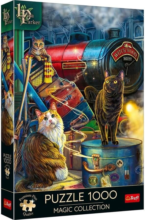 Puzzle Premium Plus Quality 1000 el. Magic Collection: Ekspres czarownic Premium Plus Quality — nowa jakość układania puzzli. Puzzle Ekspres czarownic, przedstawiają koty czekające wśród bagaży na podróż magicznym pociągiem dla czarownic. Po ich ułożeniu powstanie obraz o wymiarach 683x480 mm. Puzzle w magicznym stylu! Przenieś się do świata magii z serią puzzli Premium Plus Quality, Magic Collection. Nasze 1000-elementowe puzzle przedstawiają fascynujące obrazy autorstwa znanej artystki Lisy Parker, która specjalizuje się w ilustrowaniu mistycznych zwierząt, takich jak koty, a także nocnych pejzaży i symbolicznych scen. Każdy obraz emanuje głęboką atmosferą, łącząc w sobie tajemniczy urok natury i magii. To doskonały wybór dla miłośników zagadek i magii. Układanie puzzli to nie tylko idealna forma relaksu, ale także trening pamięci, rozwój zdolności manualnych oraz doskonała okazja do ćwiczenia koncentracji, cierpliwości i spostrzegawczości. Podziwiaj unikalne ilustracje Lisy Parker, które zabiorą Cię w podróż pełną magicznych odkryć, kawałek po kawałku. Puzzle Premium Plus Quality. Układanie w stylu Premium Premium Plus Quality to wyjątkowa seria puzzli marki Trefl, charakteryzująca się idealnie dopasowanymi elementami, wysokiej jakości tekturą i starannie wyselekcjonowanymi obrazami.  Znajdziesz w niej różnorodne kategorie tematyczne pełne wzorów, które zadowolą nawet najbardziej wymagających miłośników puzzli.  Przenieś się do świata superprodukcji filmowych z ulubionymi bohaterami, odkrywaj niesamowite zakątki świata w fotograficznym ujęciu oraz ciesz się sielskimi, malowanymi widokami. Odkrywaj wyjątkowe kadry z filmów i seriali, kolorowe grafiki oraz obrazy z magicznymi motywami fantasy. Puzzle z serii Premium Plus Quality to ogromna różnorodność oraz gwarancja jakości i satysfakcji z układania! Doceń wyjątkową jakość puzzli Odkryj wysoką jakość wykonania puzzli Premium Plus Quality. Co wyróżnia tę serię spośród pozostałych? Grubsza tektura puzzlowa, specjalny kształt puzzli oraz niezafoliowane pudełko, zabezpieczone wyłącznie naklejkami. Seria posiada też certyfikat FSC, co oznacza, że do produkcji puzzli zostały wykorzystane materiały pochodzące z lasów zarządzanych w sposób odpowiedzialny. Do puzzli został dołączony plakat w formacie A4.  Wymiary pudełka: 400x270x60 mm Wymiary obrazka po ułożeniu: 680x480 mm Produkt przeznaczony dla dzieci od 12. roku życia i dorosłych.  Szukasz pomysłu na miły wieczór w domowym zaciszu? Układanie puzzli to świetny sposób na spędzenie wolnego czasu w gronie przyjaciół i rodziny a do tego rewelacyjny trening dla mózgu. Szeroki wybór wzorów pozwala wybrać układankę dopasowaną do Twoich zainteresowań. Puzzle są doskonałym prezentem z okazji urodzin lub świąt. 11 powodów, dlaczego warto układać puzzle