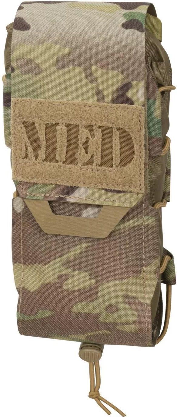 MED POUCH VERTICAL MK II Nieznacznie zmodyfikowana i zaktualizowana wersja MED POUCH HORIZONTAL. Największą zmianą jest bardziej widoczny napis MED na froncie, który w laserowo wycinanej pętli Velcro® pozwala na dodanie różnych naszywek, w tym znaków IR. Zmodyfikowano również wkładkę, aby zmniejszyć wagę i objętość woreczka. Sama apteczka zachowuje swoje najważniejsze cechy znane z poprzednich wersji. Ten dwuczęściowy IFAK został zaprojektowany tak, aby pasował do panelu bocznego chest rigu lub na pasku - zabierając podobną nieruchomość PALS jak woreczek na magazynek. Wykonane głównie z zastrzeżonego laminatu i Cordury® 500D dla zwiększenia trwałości. Wkładkę ze sprzętem medycznym można wysunąć jednym pociągnięciem klapki zamykanej na rzep. Cały sprzęt pierwszej pomocy jest dobrze rozplanowany i utrzymywany na miejscu dzięki elastycznym pętlom z taśmy. Sam wkład można szybko otworzyć jedną ręką. Wnętrze ładownicy głównej pokryte jest rzepem Velcro®, który umożliwia zamocowanie w niej ładownicy SHEARS. Ładownica jest kompatybilna nie tylko z każdą platformą modułową MOLLE / PALS, ale dzięki specjalnie zaprojektowanym szlufkom z paracordu może być zamocowana na dowolnym pasie do broni o szerokości 45mm.