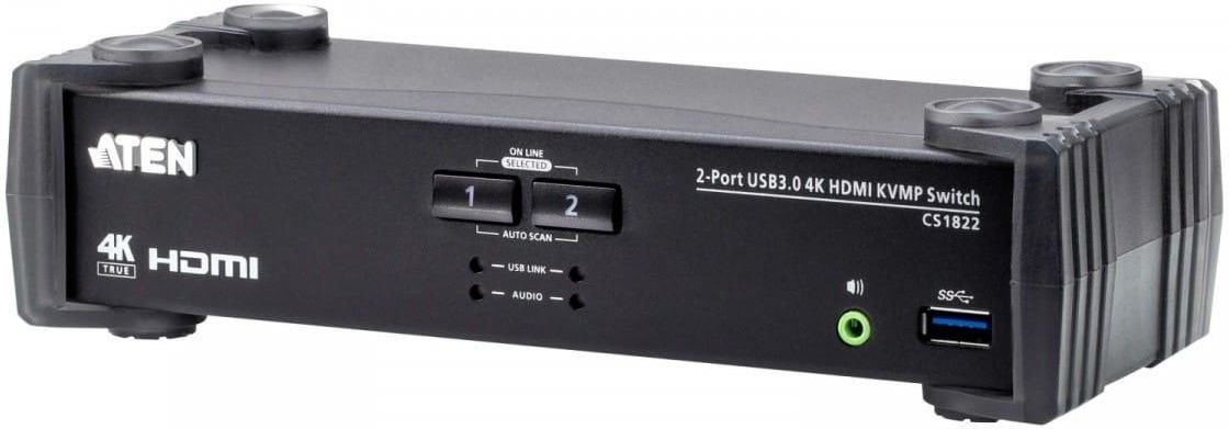 ATEN CS1822 2-portowy przełącznik KVM USB 3.0 HDMI Numer Katalogowy Produktu: 14.01.7141 Opis Produktu: Za pomocą przełącznika ATEN CS1822 KVMP™ można bez wysiłku zarządzać dwoma komputerami z interfejsem HDMI za pomocą jednej klawiatury USB, myszy i monitora HDMI. CS1822 obsługuje najlepszą w swojej klasie jakość wideo w rozdzielczości do 4K DCI (4096 x 2160 przy 60 Hz) i optymalizuje wielozadaniowość użytkownika. Dzięki opatentowanej technologii ATEN - Dzięki Video DynaSync™ użytkownicy mogą cieszyć się lepszą rozdzielczością ekranu i szybszym przełączaniem między systemami. Ponadto dostępny jest standardowy tryb EDID, który zapewnia płynne uruchamianie i wysoką jakość wyświetlania oraz eliminuje problemy związane z kompatybilnością monitorów. Również CS1822 posiada tryb Audio Mixer, który miksuje źródła dźwięku z dowolnych dwóch podłączonych komputerów jako wyjście audio, dzięki czemu użytkownicy nie muszą przegapić żadnego powiadomienia systemowego, nawet gdy uwaga KVM skupia się na innych komputerach. Dzięki zintegrowanemu koncentratorowi USB 3.1 Gen 1, CS1822 zapewnia transfer danych z prędkością do 5 Gb/s, co pozwala na przyspieszenie operacji multimedialnych i łatwe udostępnianie urządzeń peryferyjnych USB. Jedna klawiatura/mysz USB i jeden monitor HDMI obsługują dwa komputery i współdzielą dwa urządzenia peryferyjne USB Obsługuje najwyższą jakość wideo - 4K UHD (3840 x 2160 przy 60 Hz) i 4K DCI (4096 x 2160 przy 60 Hz) Video DynaSync™ - ekskluzywna technologia ATEN eliminuje problemy z wyświetlaniem przy uruchamianiu i optymalizuje rozdzielczość podczas przełączania między różnymi źródłami Zintegrowany 2-portowy port USB 3.1 Gen 1 hub z szybkością transferu danych SuperSpeed 5 Gbps Tryby miksera audio - miksuje do dwóch źródeł dźwięku jako wyjście audio Wybór komputera za pomocą przycisków, klawiszy skrótu, myszy1 i poleceń RS-232 Tryb EDID w standardzie ATEN - płynne włączanie, odtwarzanie w wysokiej jakości i optymalizacja rozdzielczości w celu uniknięcia problemów z kompatybilnością Niezależne przełączanie między KVM, urządzeniami peryferyjnymi USB i koncentracja na dźwięku stereo HDMI 2.0 kompatybilny; HDCP 2.2 kompatybilny Obsługuje HD audio Wykrywanie przełączania Możliwość aktualizacji firmware Specyfikacja Produktu: Producent: ATEN Kolor: czarny Szerokość: 88 mm Wysokość: 55.5 mm Waga: 0.74 kg Głębokość: 210 mm Grupa produktów: Przełączniki KVM / PC Udziały Zakres dostawy: 1x CS1822 2-portowy przełącznik USB 3.0 4K HDMI KVMP™. 2x LIN6-19V Wydanie katalogowe: 23.1 Waga opakowania: 1.791 Wymiary (HxWxD): 55.5 x 88 x 210 mm Rodzaj produktu: Przełącznik KVM. HDMI Szerokość opakowania: 100 mm Głębokość opakowania: 300 mm Strona katalogu: 3.07 Napięcie zasilania: 5.V Wymagane zasilanie: tak Max. rozdzielczość (nominalna): 4096 x 2160 @60Hz PC: podłączenie myszy/klawiatury, Złącze monitora, Połączenie z dołączonym Kable Liczba komputerów PC: 2 Kolor (obudowa): black Montaż 19: no, Nie Obsługiwana platforma PC: USB 3.0 Włączenie urządzenia do drukowania: tak Casable: no, Nie Zintegrowana konsola: Nie, No Przełączanie poprzez scan-run: spada poza Liczba portów USB Hub: 2 Przełączanie za pomocą OSD: no, Nie Liczba Konsola cyfrowa: 1 Możliwość przełączania dźwięku niezależnie od KVM: tak Hub USB przełączany oddzielnie od KVM: tak Konsola analogowa: Połączenie monitora, Złącze myszy/klawiatury Zintegrowany hub USB: tak