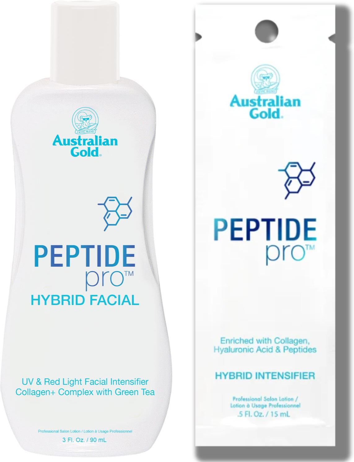 Australian Gold Peptide Pro Do Twarzy 90ml + Peptide Pro Do Ciała 15mlAustralian Gold Peptide Pro Hybrid Facial Przyspieszacz Do Twarzy 90mlUspokój swoją skórę i pozostaw ją głęboko nawilżoną dzięki Peptide Pro™ Hybrid Facial . Ta lekka, szybko wchłaniająca się formuła jest unikalnie zmieszana z peptydami kolagenowymi i zieloną herbatą, aby pomóc zwiększyć korzyści płynące z terapii światłem czerwonym. Mieszanka intensyfikująca Deluxe wykorzystuje tyrozynę i glicerynę, aby pomóc zbudować głęboką, piękną opaleniznę. Daj swojej skórze zastrzyk energii, którego potrzebuje!Technologia kolorówIntensywny kolor: Wiadomo, że tyrozyna pomaga stymulować produkcję melaniny i wspomaga zatrzymywanie wilgoci dzięki bogatej zawartości kwasów tłuszczowych, tworząc i utrzymując wspaniały kolor.Technologia pielęgnacji skóryAustralian Gold Peptide Pro Hybrydowy Przyspieszacz 15mlOdkryj prawdziwy potencjał swojej skóry dzięki Peptide Pro™. Ta formuła premium jest doskonale skomponowana z kolagenem i kwasem hialuronowym, które pod wpływem czerwonego światła tworzą niezrównaną opaleniznę. Aminokwasy wspomagają syntezę białek i sprawiają, że skóra wygląda na gładszą i nawilżoną. Intensified Color pomaga stymulować produkcję melaniny odpowiedzialnej za rozwój koloru, podczas gdy Lavish Vitamin Fusion wspiera obronę skóry przed wolnymi rodnikami. Daj swojej skórze tyle witamin, ile potrzebuje!Właściwości:Wzmacniacz UV i światła czerwonegoOlej kokosowy i z nasion konopiTyrozynaAloesWitaminy A, E i B5Inhibitor ATOZapach: Tropical Rush - korzenny aromat owoców cytrusowych, ananasa, kokosa, róży i bursztynu.