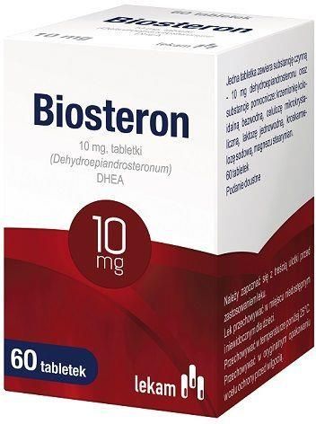 Biosteron 10mg 60 tabl Właściwości: Substancją czynną leku Biosteron 10 mg jest dehydroepiandrosteron (DHEA). DHEA jest nieaktywną substancją wykorzystywaną do syntezy hormonów płciowych. W różnych tkankach (np. gruczoł sutkowy, gruczoł krokowy, narządy rodne, mięśnie szkieletowe, kości) DHEA ulega przemianie do estrogenów – u kobiet i androgenów – u mężczyzn. Największe stężenia DHEA w surowicy występują w okresie młodości (2 i 3 dekada życia), po czym następuje powolny spadek jego stężeń we krwi tak, że u osób w wieku 80 lat. DHEA stanowi zaledwie ok. 10-20 % stężenia hormonu występującego u trzydziestolatka. Badania eksperymentalne oraz badania kliniczne (wykonane u ludzi) wskazują, że niedobór DHEA może być przyczyną niekorzystnych zjawisk związanych z procesem starzenia się jak np.: osłabienie pamięci, sprawności intelektualnej, zdolności koncentracji, pogorszenie samopoczucia i depresja, dolegliwości psychiczne i fizyczne związane z okresem menopauzy u kobiet i andropauzy u mężczyzn, zmniejszenie siły mięśni, uczucie nadmiernego zmęczenia, zespół przewlekłego zmęczenia, zmniejszenie odporności na stres,- spadek popędu płciowego i zmniejszenie sprawności seksualnej, otyłość, zmniejszona wrażliwość tkanek na insulinę, która może powodować cukrzycę, miażdżyca, zaburzenia snu spadek odporności organizmu na zakażenia wirusowe i bakteryjne. Uzupełnienie niedoboru DHEA może przeciwdziałać wyżej wymienionym procesom i zjawiskom, a w efekcie poprawiać stan zdrowia i jakość życia starzejących się osób. Wysokie stężenia DHEA we krwi zwykle związane są z mniejszym ryzykiem zgonu, a w szczególności zgonu z powodu chorób sercowo-naczyniowych.  Po podaniu doustnym DHEA dobrze wchłania się z przewodu pokarmowego i z krwią dociera do tkanek docelowych, w których ulega przemianie do właściwych hormonów płciowych. Nasilenie tej przemiany jest zmienne i dostosowane do aktualnych potrzeb organizmu, płci, wieku, stanu zdrowia człowieka oraz cech osobniczych. DHEA jest wydalany głównie z moczem w postaci metabolitów. Okres półtrwania hormonu we krwi wynosi około 12 godzin. Stosowanie: Zalecana początkowa jednorazowa dawka dobowa dla kobiet wynosi 5 mg, natomiast zalecana dawka maksymalna 25 mg. Zalecana początkowa jednorazowa dawka dobowa dla mężczyzn wynosi 10 mg, natomiast zalecana dawka maksymalna 50 mg. Początkową dawkę leku należy stopniowo zwiększać (o 5 mg do 10 mg co 2 tygodnie) do czasu uzyskania pożądanych efektów terapeutycznych. Osoby w podeszłym wieku wymagają z reguły większych dawek leku z powodu zmniejszonego wytwarzania hormonu. Efekt działania leku nie jest natychmiastowy i występuje po kilku tygodniach stosowania, dlatego Biosteron jest przeznaczony do długotrwałego stosowania. Biosteron należy przyjmować rano raz na dobę, zgodnie z naturalnym rytmem wydzielania DHEA. Lek należy przyjmować z posiłkiem, aby ułatwić jego wchłanianie. W przypadku zażycia większej dawki leku Biosteron niż zalecana, mogą nasilić się działania niepożądane leku. Nie są znane przypadki przedawkowania. Nie należy stosować większych dawek niż zalecane. Gdy wystąpią nasilone działania niepożądane należy odstawić lek i skontaktować się z lekarzem. Skład: Substancją czynną leku jest dehydroepiandrosteron (DHEA, Dehydroepiandrosteronum). 1 tabletka zawiera 10 mg DHEA. Substancje pomocnicze: krzemionka koloidalna bezwodna, celuloza mikrokrystaliczna, laktoza jednowodna, kroskarmeloza sodowa, magnezu stearynian.