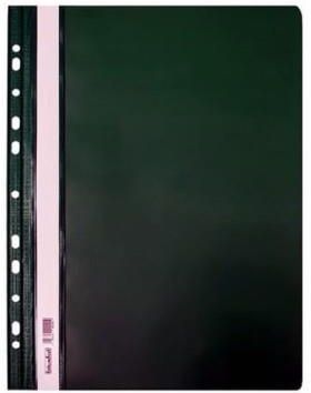 Skoroszyt wpinany A4 twardy BIURFOL folia PVC, przód twardy przezroczysty, tył twardy kolorowy boczna perforacja umożliwia wpięcie do segregatora z dowolnym ringiem w środku blaszka i wąs o długości 16,5 cm, umożliwiający wpięcie dokumentów do 2 cm wymienny papierowy pasek do opisu dwa wycięcia ułatwiające wysuwanie paska zaokrąglone rogi obu okładek kolor zielony kod producenta ST-02-02 Nr oferty xSale BF125-4