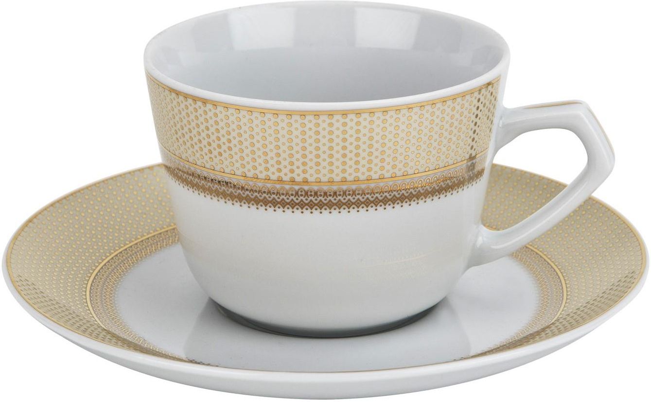 Elegancki zestaw filiżanek ze spodkiem z charakterem dla 6 osób. Wyraźne złote zdobienia dodają porcelanie elegancji i wykwintności. Zestaw zawiera: 6x filiżanka 200ml 6x spodek 16cm Produkt można używać w zmywarce. Aby zachować dłuższą żywotność produktu i jego niezmienioną formę zaleca się: - stosować jedynie delikatne środki myjące - żele - stosować tylko programy do delikatnego mycia - naczynia w zmywarce układać luźno, by ich stykanie się w trakcie mycia nie powodowało zarysowań rantów - przed włożeniem do zmywarki nie stosować ostrych gąbek lub innych przedmiotów mogących spowodować zarysowania - przy myciu ręcznym lub wstępnym nie stosować past lub proszków o właściwościach ściernych - nie stosować środków żrących ani dezynfekujących Produkt nie nadaje się do używania w kuchenkach mikrofalowych.