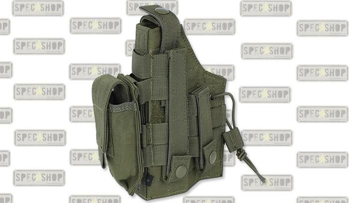 Wykonana z poliestru o gęstości 1000D, profesjonalna kabura modułowa na broń krótką serii Beretta M92F i podobne. Kabura posiada regulację paska zabezpieczającego zapinanego zatrzaskiem. Dodatkowo broń zabezpieczana jest elastycznym trokiem z uchwytem. W zestawie otrzymujemy dołączony do kabury pokrowiec na magazynek, który można zamontować na pasie lub kamizelce. Pionowe pasy montażowe, zgodne ze standardem MOLLE/PALS pozwalają na dołączenie kabury do kamizelki, pasa, panelu udowego. Kaburę można dostosować do chwytu prawo lub leworęcznego.