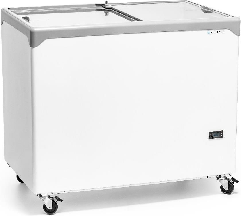 Zamrażarka skrzyniowa przeszklona Forgast o pojemności całkowitej 290 l. Przeznaczona jest do przechowywania produktów spożywczych w temperaturze do -23°C. Obudowa urządzenia wykonana ze stali malowanej proszkowo. Wnętrza komory - z gładkiej blachy aluminiowej łatwej w utrzymaniu czystości i odladzaniu. Wydajny system chłodzenia oraz nowoczesny materiał izolujący pozwolił na uzyskanie wysokiego stopnia energooszczędności. Dane techniczne Czynnik chłodniczy: R290 Zasilanie:230 V Moc:132 W Pojemność całkowita:290 l Pojemność użytkowa:209 l Wymiary zewnętrzne:103x65x89 cm Zakres temperatury:-18 do -23 ºC Zamek: tak Ilość czynnika chłodniczego:85 g Możliwe zakresy temperatur: - Pozycja pomiędzy cyfrą 0 a 2 pozwala na ustawienie temperatury chłodzenia od 1°C do 5°C - Pozycja pomiędzy cyfrą 2 a 3 odpowiada temperaturze 0°C - Pozycja pomiędzy cyfra 3 a 5 pozwala na ustawienie temperatury od 0°C do -18/-23°C Szklana pokrywa ułatwia lokalizację produktu przed otwarciem komory, co ma istotny wpływ na zużycie energii. Zastosowanie przegrody pozwala na przechowywanie różnych produktów, a dołączone dwa kosze znacznie podwyższają walory użytkowe urządzenia. Pokrywę stanowią płaskie szyby wyposażone w ramę i zamek zabezpieczający zawartość zamrażarki. Odpływ zainstalowany w dnie komory ułatwia odprowadzenie wody powstającej w trakcie jej rozmrażania oraz mycia. Dołączony zestaw kółek z hamulcem ułatwia transport lub korektę ustawienia urządzenia. Zintegrowany cyfrowy panel sterowania, wskazuje aktualną temperaturę wnętrza komory, umożliwia jej precyzyjną zmianę oraz ułatwia wykonanie procesu rozmrażania.