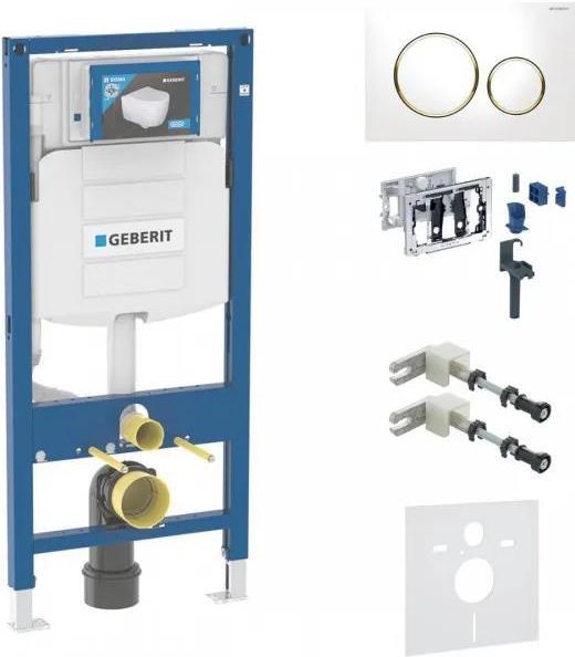 Stelaż podtynkowy - rama samonośna malowana proszkowo z nawierconym otworem ø 9 mm do zamocowania w konstrukcji drewnianej, przygotowana pod wsporniki do misek ustępowych o małej powierzchni przylegania - nogi montażowe ocynkowane o regulowanym położeniu w zakresie 0–20 cm, z funkcją samohamowania - stopy z możliwością zmiany pozycji - głębokość stóp odpowiednia do montażu w profilach U UW 50 i UW 75 oraz szynach systemowych Geberit Duofix Kolano przyłączeniowe z możliwością montażu na różnych głębokościach bez użycia narzędzi, zakres regulacji 45 mm - mocowanie kolana przyłączeniowego izolowane akustycznie - spłuczka podtynkowa uruchamiana z przodu z izolacją przeciwroszeniową - w przypadku ustawień fabrycznych ponowne spłukiwanie możliwe natychmiast - możliwość zredukowania ilości wody spłukującej do 4 / 2 l - prace montażowe i serwisowe przy spłuczce podtynkowej bez użycia narzędzi - przyłącze wody z tyłu lub na górze na środku - obudowa ochronna otworu rewizyjnego chroni przed wilgocią i zabrudzeniami z możliwością skrócenia - wyposażono w rurkę ochronną umożliwiającą szybkie podłączenie wody do toalet myjących Geberit AquaClean z możliwością zamocowania przyłącza elektrycznego Pojemnik na wkład Geberit DuoFresh, do spłuczki podtynkowej: - ramka mocująca z mechanizmem odchylania - płytka ochronna - pojemnik wiszący na wkład Geberit DuoFresh - szuflada z uchwytem na wkład Geberit DuoFresh - 8 wkładów Geberit DuoFresh Wsporniki dystansowe: - regulacja głębokości 13-20 cm - materiał cynkowy odlew ciśnieniowy - do mocowania elementów montażowych Geberit Duofix przed ścianami gipsowo-kartonowymi i ścianami pełnymi - do mocowania w ściance instalacyjnej na wysokość elementu montażowego - płynna regulacja głębokości od przodu, z szybkim ustawieniem - mocowanie do ściany obracane o 360° - pręt gwintowany M10, ocynkowany - 2 sztuki w zestawie Zestaw do izolacji akustycznej: - do izolacji hałasu materiałowego WC i bidetów - do WC i bidetów z odstępem między mocowaniami 18 lub 23 cm - materiał PE-E - kolor biały Przycisk spłukujący: - 2 zakresy spłukiwania - uruchamianie przez naciśnięcie od przodu - materiał: tworzywo sztuczne - kolor płytki i przycisków: biały - kolor pierścieni ozdobnych: pozłacane