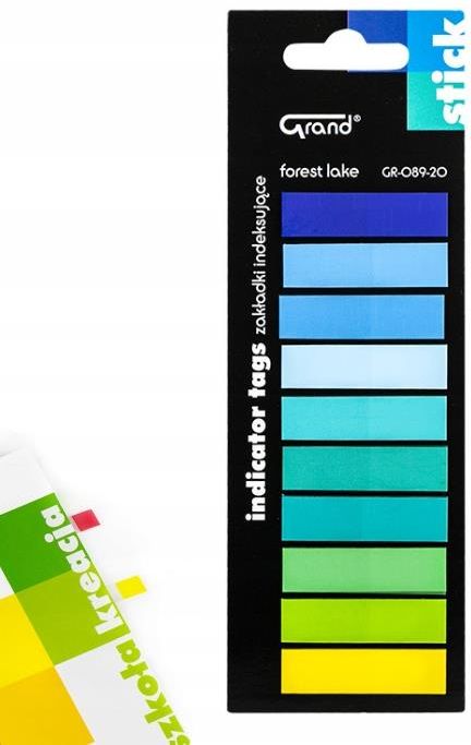 Grand ID:11568/KW1477 Zakładki indeksujące GRAND GR-089-20 10kol foliowe rozmiar: 45 x 11 mm 10 kol. x 20 sztuk kolory leśnego jeziora Forest lake Zakładki samoprzylepne wielokrotnego użytku wielorazowe: mogą być wielokrotnie przyklejane i odklejane po odklejeniu nie pozostawiają śladów prosty sposób na oznaczenie ważnych informacji w książce czy katalogu dają możliwość znakowania kolorem różnych kategorii informacji szeroka gama odcieni w błękitno-zielonej tonacji