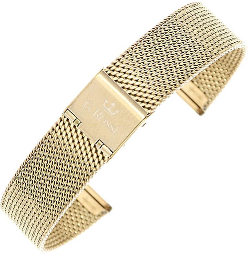 Stalowa bransoleta do zegarka typu mesh 22 mm firmy G. ROSSI. Długość całkowita: 185 mm Materiał: Metal. Zapięcie: na klik Kolorystyka: Kolor złoty. Wymiary: szerokość przy mocowaniu: 22 mm
