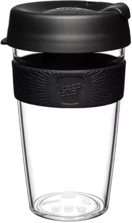 KeepCup to ekologiczne kubki wielokrotnego użytku. Wyprodukowane w Australii. Bardzo praktyczne - idealne na kawę czy herbatę, można myć w zmywarce, podgrzewać w mikrofalówce, wygodne do noszenia, pasują do większości uchwytów samochodowych Celem kubków KeepCup jest popularyzowanie działań proekologicznych - używania wielorazowych opakowań. Pojemność: 454ml Kolory poszczególnych elementów: Kubek: Przezroczyste tworzywo sztuczne bez BPA/BPS Wieczko: Czarny Korek: Czarny Opaska: Czarny