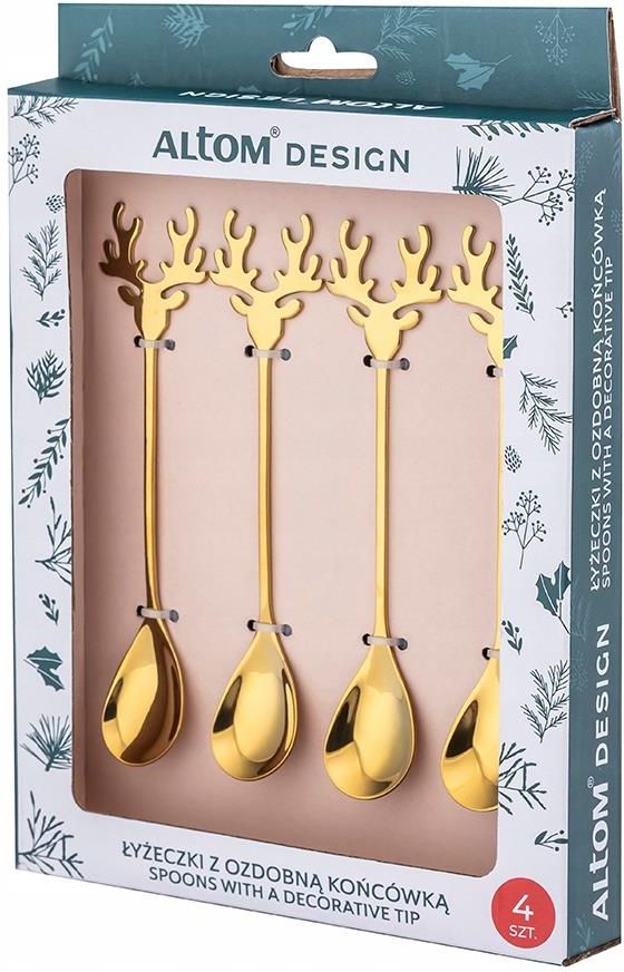 Złote łyżeczki do herbaty świąteczne Renifer 4 szt. . Świąteczne akcesoria potrafią dodać wyjątkowego uroku codziennym czynnościom, wprowadzając do domu ciepłą, bożonarodzeniową atmosferę. Ozdobne sztućce, takie jak łyżeczki z dekoracjami, są nie tylko praktyczne, ale również stanowią doskonały akcent świątecznego stołu, idealnie komponując się z resztą dekoracji. Komplet 4 łyżeczek ozdobnych to elegancki zestaw, który wyróżnia się świątecznym akcentem umieszczonych na końcu każdej łyżeczki. Te wyjątkowe łyżeczki wykonane są z wysokiej jakości materiałów, dzięki czemu są trwałe i odporne na codzienne użytkowanie. Ozdobna końcówka uchwytu nadaje im unikalny charakter, idealnie pasujący do świątecznych spotkań przy kawie czy herbacie. Zestaw zapakowany jest w estetyczne pudełko, co czyni go również doskonałym pomysłem na prezent. Dlaczego warto Złote łyżeczki ze świątecznymi motywami wprowadzą do rytuału picia herbaty magiczną atmosferę. Wykonanie ze stali nierdzewnej gwarantuje ich trwałość. Ozdobne akcenty dodają łyżeczkom świątecznego charakteru. Łyżeczki świetnie pasują do świątecznych zastaw stołowych. Doskonale sprawdzą się do kawy, herbaty, deserów czy świątecznych wypieków. Są dealne na prezent - zestaw zapakowany w eleganckie pudełko, gotowy do wręczenia.
