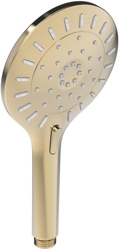 słuchawka prysznicowa kształt: okrągła ilość funkcji: 3 rodzaje funkcji: Rain (intensywny, delikatny strumień), Massage (intensywny, orzeźwiający strumień masujący), Mixed (odświeżający, szeroki strumień) przepływ Rain(l/min-3 bar): 5.7 kolor: złoty połysk PVD