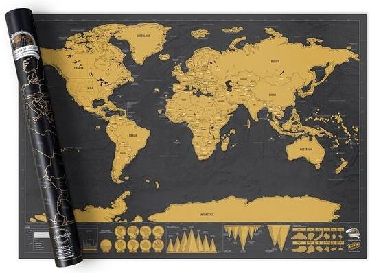 Oto najlepiej sprzedająca się wersja naszej legendarnej Mapy Zdrapki. Wyprodukowana w Wielkiej Brytanii. Jak nazwa Deluxe sama wskazuje - ta wersja różni się od standardowej Mapy Zdrapki następującymi elementami: Jest większa, są na niej naniesione wyspy oraz znacznie więcej intrygujących detali geograficznych. Czarne tło jest pokryte miedzianą folią, dzięki czemu mapa wygląda naprawdę ekskluzywnie. Po zdrapaniu folii ukazują się pięknie nasycone kolory. Jeśli nie jesteś obeznany z tradycyjną Mapą Zdrapką, poniżej przedstawiamy informacje na jej temat. Kochasz podróże, jesteś obieżyświatem a każdą wolną chwilę spędzasz planując swój następny wyjazd? Jeśli tak to nie marnuj czasu na oznaczanie miejsc, które odwiedziłeś za pomocą szpilek wbitych w mapę lub tym podobnych wynalazków. Podejdź do sprawy profesjonalnie - kup sobie Mapę Zdrapkę.Wszystkie obszary lądowe tej pęknie wykonanej mapy są pokryte specjalną folią. Aby zaznaczyć miejsce, które kiedyś odwiedziłeś a przy okazji odkryć więcej szczegółowych informacji - należy zdrapać pokrywającą je folię. Nie martw się, jeśli nie odwiedziłeś jeszcze zbyt wielu miejsc. Być może chęć zdrapania jakiegoś nowego obszaru tej mapy zmotywuje Cię do spakowania plecaka i wyruszenia w drogę. Przygotuj się na to, że Mapa Zdrapka na długo zawiśnie na ścianie Twojego pokoju. Do odkrycia jest tak dużo a autorzy mapy nie zapomnieli o pokryciu folią całego obszaru Antarktydy. Szerokiej drogi.