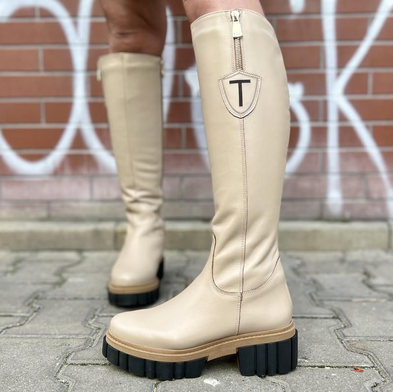 Modne skórzane grubym spodzie. Kozaki wykonane zostały z wysokiej jakości naturalnej skóry licowej, wyjątkowo trwałej i komfortowej w użytkowaniu, by chłody nie były stopom straszne w butach zastosowano lekkie ocieplenie. Buty na grubej podeszwie to MUST HAVE tego sezonu. Efektowne beżowe kozaki mają wysoką, zgrabną cholewkę, od zewnątrz ozdobioną emblematem w kształcie tarczy, nad którym umieszczono dekoracyjny, złoty suwak, od strony wewnętrznej producent umieścił klasyczny suwak, umożliwiający założenie butów. Fason kozaków TYMOTEO jest inspirowany najbardziej aktualnymi trendami ze światowych wybiegów, dwukolorowa, gruba podeszwa nie tylko świetnie się prezentuje ale także zapewnia wygodę i stabilność. Stylowe kozaki na każdą okazję, wygodne i uniwersalne, w pięknym, neutralnym odcieniu, który doskonale wpisuje się w jesienną paletę barw.