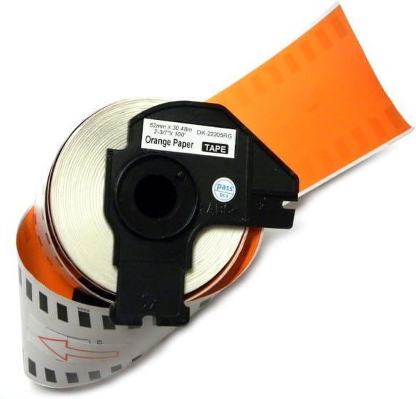 Zamiennik taśmy DK-22205 Taśma papierowa ciągła samoprzylepna wysokiej jakości Rolka: 62mm x 30.48m Kolor: pomarańczowa etykieta / czarny napis Kompletna wraz z plastikowym elementem. Kompatybilna w 100% z drukarkami QL Do drukarek QL: QL-500, QL-560, QL-570, QL-580N, QL-650, QL-700, QL-710W, …