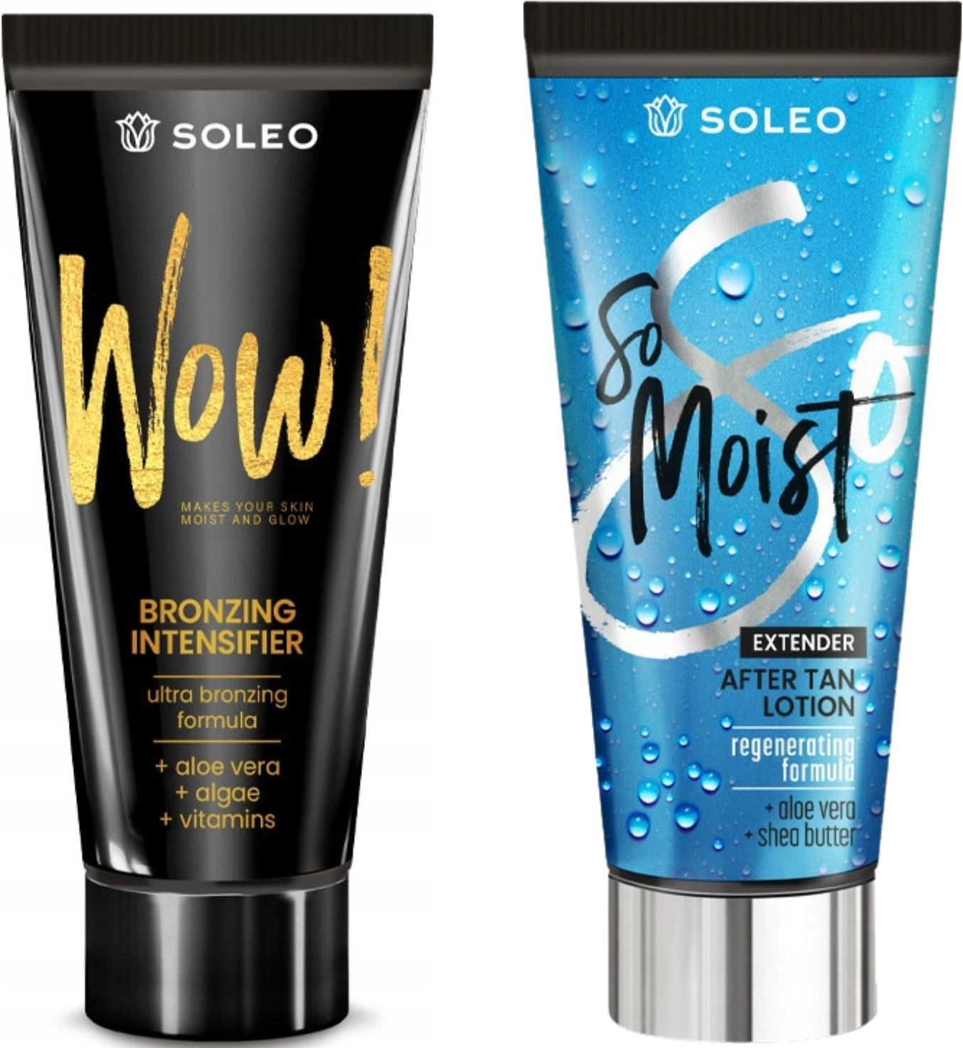 Soleo Wow! + So Moist Po Opalaniu GratisSoleo Wow! Ultra Bronzer Do Opalania 150mlBronzer Soleo Wow! rekomendowany dla: osób, które opalają się regularnie i utrzymują opaleniznę na wysokim poziomieMocny bronzer z witaminami i aloesemSkładniki aktywne:Dha, wyciąg z orzecha włoskiegoTyrozynaAloesAlgiWitaminy: b6, b3, b2Zapach: tropical fruitSposób użycia:Bezpośrednio przed opalaniem nanieś równomierną warstwę na całą powierzchnię ciała. Po aplikacji, umyj dokładnie ręce! Pamiętaj, że produkt przeznaczony jest wyłącznie do użytku zewnętrznego. Aby skutecznie wzmacniać i zachować na opaleniznę dłużej używaj każdorazowo przed wizytą w solarium.Soleo So Moist Balsam Do Całego Ciała Po Opalaniu 150mlSo Moist to balsam przedłużający opaleniznę do codziennej pielęgnacji ciała. Specjalna regenerująca formuła intensywnie nawilża opaloną skórę. Dba o piękny blask i aksamitną miękkość.Ciesz się piękną opalenizną i zdrową skórą znacznie dłużej!Składniki aktywne: aloes, masło shea, olej szafranowy, witaminy B3, B6 ,hydrolizowane proteiny roślinneZapach: aqua kissBalsam Soleo So Moist rekomendowany dla: wszystkich osób opalających się solarium i na słońcu, po opalaniuSposób użycia:Równomierną ilość eliksiru rozprowadź na skórze całego ciała. Stosuj produkt po opalaniu, ale także jako codzienną pielęgnacją przeciwstarzeniową i kondycjonującą skórę. Możesz stosować produkt nawet dwa razy dziennie, według potrzeb i uznania.