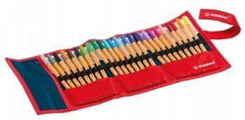 Zestaw cienkopisów Stabilo Point w piórniku Rollerset 25 kolorów Uniwersalny cienkopis do pisania, podkreślania, kreślenia i kolorowania. Mocna, oprawiona w metal końcówka jest odporna na złamania i rozwarstwienia, co gwarantuje wysoki komfort pisania aż do całkowitego wyczerpania tuszu. Grubość linii – 0,4 mm. Wentylowana skuwka umożliwia oddychanie w przypadku nagłego połknięcia. Niezaprzeczalny nr 1 wśród cienkopisów od 1977 r. W każdej sekundzie sprzedają się 4 cienkopisy point 88 w Europie. Nylonowy piórnik z kieszonką na suwak, zapinany na rzep. Piórnik występuje w wielu wielokolorowych wzorach . Zawiera 25 cienkopisów w kolorach podstawowych. W skład zestawu 25 kolorów wchodzą: 88/13 zieleń lodowa 88/22 błękit pruski 88/26 brzoskwinia 88/32 ultramaryna 88/33 zieleń jasna 88/36 zieleń szmaragdowa 88/40 czerwień jasna 88/41 błękit ciemny 88/43 zieleń liściowa 88/44 żółcień 88/45 brąz 88/46 czarny 88/50 czerwień ciemna 88/51błękit turkusowy 88/53 zieleń turkusowa 88/54 oranż 88/55 fiolet 88/56 róż 88/57 lazur 88/58 lila 88/59 jasny lila 88/63 zieleń ziemista 88/89 ochra ciemna 88/94 szarzeń zimna jasna 88/96 szarzeń ciemna Jedyny cienkopis dostępny aż w 65 kolorach. Dostępny również piórnik Rollerset (w kolorach Stabilo) z 30 kolorami cienkopisów. Dodatkowo 5 cienkopisów w kolorach neonowych.