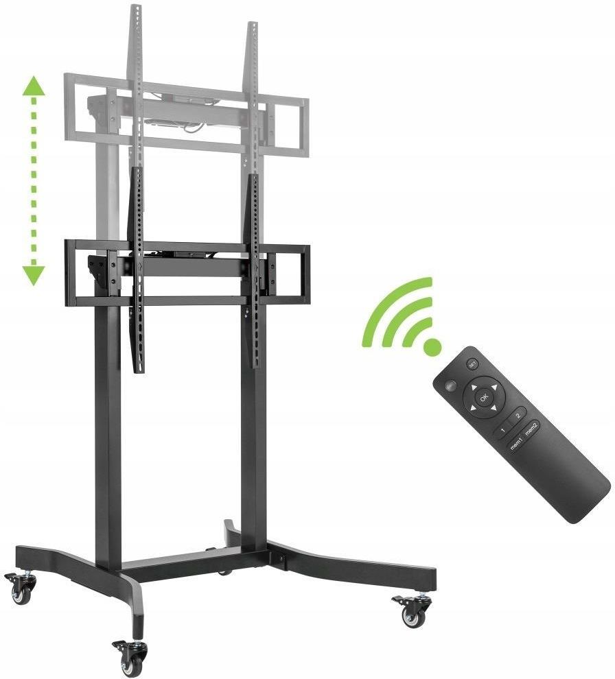 KOD: 366990 Techly Mobilny Stojak Wózek do Telewizora, Monitora LED/LCD 55”-100” do 120 kg z Elektryczną Regulacją Wysokości – na Pilot Cechy produktu: ➡️ Stojak telewizyjny umożliwiający wygodny montaż ekranu LED/LCD/PDP, monitora lub TV o wielkości 55” - 100” ➡️ Elektryczna regulacja wysokości sterowana pilotem pozwala na swobodne ustawienie optymalnego położenia ekranu ➡️ Wydajny, podwójny silnikelektryczny gwarantuje płynną regulację nawet dużych i ciężkich wyświetlaczy ➡️ Kompatybilny z ekranami z mocowaniem VESA od 200x200 do 800x600 ➡️ Podstawa z kółkami jezdno-skrętnymi, które gwarantują łatwe przemieszczanie stojaka ➡️ Kółka z hamulcem umożliwiają bezpieczne zablokowanie pozycji stojaka ➡️ Konstrukcja z najwyższej jakości materiałów gwarantuje stabilność oraz maksimum bezpieczeństwa ➡️ Zintegrowany, wewnętrzny system prowadzenia przewodów umożliwia schludne ukrycie kabli połączeniowych ➡️ W zestawie wszystkie niezbędne elementy montażowe (śruby do różnych modeli TV, podkładki, dystanse, itp.) ➡️ Idealny do prowadzenia video konferencji, prezentacji oraz szkoleń jak również zastosowania w warunkach domowych Parametry produktu: ➡️ Typ produktu: stojak mobilny, elektryczny wózek TV ➡️ Przeznaczenie: telewizor, monitor LCD/LED/PDP, ekran, TV ➡️ Wielkość wyświetlacza: 55” - 100” ➡️ Dopuszczalne obciążenie: do 120 kg ➡️ Elektryczna regulacja wysokości: 1100 – 1600 mm (środek uchwytu TV) ➡️ Napęd: podwójny silnik elektryczny ➡️ Sposób sterowania: pilot IR ➡️ Funkcja pamięci dwóch poziomów wysokości ➡️ Mocowanie VESA: 200 x 200 300 x 200 400 x 200 300 x 300 400 x 300 600 x 200 350 x 350 400 x 400 600 x 400 800 x 400 800 x 600 ➡️ Podstawa na samonastawnych kółkach z hamulcem ➡️ Stalowa konstrukcja z walcowanej na zimno blachy o grubości 2 mm ➡️ Wymiary podstawy: 1075 x 970 mm ➡️ Maksymalna wysokość całkowita: 1925 mm ➡️ Rozstaw pomiędzy kolumnami: 504 mm ➡️ Wykończenie powierzchni: malowanie proszkowe ➡️ Kolor: czarny mat ➡️ Waga: 40.95 kg Zawartość opakowania: ➡️ Techly Elektryczny stojak mobilny do TV 55-100” ➡️ Pilot regulacji wysokości ➡️ Elementy montażowe ➡️ Instrukcja montażu P/N: ICA-TR68M, 366990