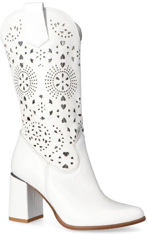 Skórzane ażurowe kozaki, idealne na wiosenne i letnie dni. Białe kozaczki fasonem cholewki nawiązują do tradycyjnych kowbojek, subtelny szpiczasty nosek i wysoki obcas-słupek dodają im kobiecego charakteru. Kozaki wykonano z wysokiej jakości skóry licowej, wycinanej w ażurowy wzór. Ażurowy motyw dodaje butom lekkości i sprawia, że stają się świetnym obuwiem także na okres letni. Niebanalne buty dla kobiet śledzących najnowsze modowe trendy, świetnie współgrają z pastelowymi i dżinsowymi stylizacjami, pięknie wyglądają ze zwiewnymi, długimi sukienkami o nieco hipisowskim charakterze. Nasze buty są wykonane z wysokiej jakości naturalnej skóry licowej, przyjaznej dla stóp, zapewniającej komfort i cyrkulację powietrza. Grubszy obcas mimo swojej wysokości zapewnia stabilność i wygodę. Buty są zapinane na suwak, dodatkową ozdobę stanowi srebrny akcent przy obcasie.