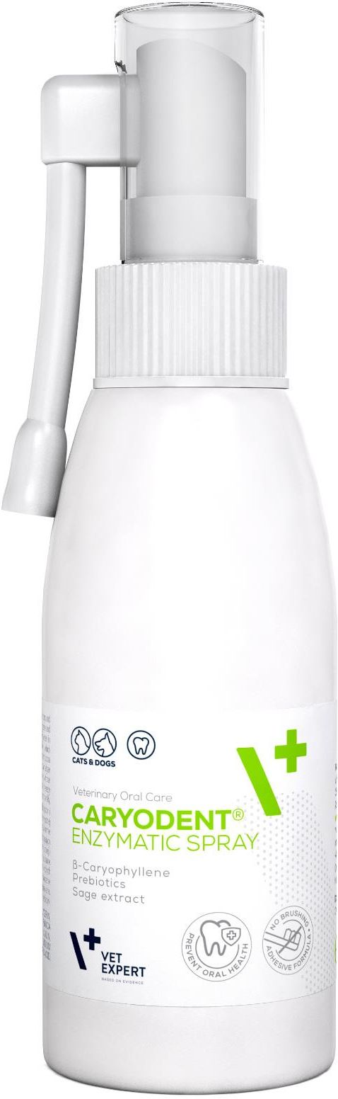 Vet Expert Caryodent Enzymatic 75g Spray Do Higieny Jamy Ustnej Dla Psa i Kota Enzymatyczny spray do higieny jamy ustnej dla psa i kota. Może być stosowany u zwierząt rosnących. Specjalna, adhezyjna postać spray`u pozwala na utrzymanie higieny jamy ustnej, bez potrzeby codziennego mycia zębów. Odpowiednie połączenie składników preparatu zapewniają jego potrójne działanie: rozpuszczenie istniejącej płytki nazębnej (kompleks naturalnych enzymów) i hamowanie narastania nowej (beta-kariofilen), utrzymanie równowagi mikrobiomu jamy ustnej (prebiotyki, beta-kariofilen), oraz odświeżenie oddechu (ekstrakt z szałwii). Dlaczego CARYODENT® ENZYMATIC SPRAY? Higiena jamy ustnej dla zwierząt nie tolerujących szczotkowania. Produkt powstał we współpracy z lekarzami weterynarii i ekspertami stomatologii zwierzęcej. Zawiera ekstrakt z szałwii, który odświeża oddech. β-KARIOFILEN – składnik naturalnego pochodzenia; wspomaga utrzymanie w optymalnej kondycji śluzówkę jamy ustnej i dziąseł (szczególnie w przypadku zwierząt z nadwrażliwością na chlorheksydynę). PREBIOTYKI - pomagają utrzymać równowagę mikrobiomu jamy ustnej. GLICERYNA – nawilża śluzówkę jamy ustnej. EKSTRAKT Z SZAŁWII - odświeża oddech, wspomaga gojenie i regenerację dziąseł. HYDROKSYAPATYT - związek ceniony za szereg właściwości, w tym remineralizację, wsparcie przywracania integralności zębów, pomagający zmniejszyć ich nadwrażliwość i ograniczający przyleganie bakterii, co utrudnia proces tworzenia się płytki nazębnej. Dodatkowo optycznie poprawia wygląd zębów, które stają się wizualnie bielsze i jaśniejsze. ENZYMY (amyloglukozydaza, laktoperoksydaza, oksydaza glukozowa) - pomagają rozpuszczać płytkę nazębną i resztki jedzenia, zapobiegając tym samym tworzeniu się kamienia nazębnego. Sposób użycia: Preparat należy stosować 1 x dziennie. Aplikować od 1 do 2 dawek na jedną stronę, w kieszonkę policzka na zęby i dziąsła, trzymając aplikator w odległości 1-2 cm od błony śluzowej. Pozostawić bez spłukiwania. Przed użyciem wstrząsnąć. W razie potrzeby przed rozpoczęciem stosowania preparatu należy skonsultować się z lekarzem weterynarii, gdyż konieczne może być usunięcie kamienia nazębnego. Środki ostrożności: Unikać kontaktu z oczami. Chronić przed dostępem dzieci. Produkt nie jest przeznaczony dla ludzi, stosować wyłącznie u zwierząt. Preparat należy stosować zgodnie z jego przeznaczeniem, przestrzegając wskazówek i zaleceń zawartych w sposobie użycia. Warunki przechowywania: Chronić przed działaniem promieni słonecznych. Przechowywać w temperaturze od +15oC do +20oC. Składniki: Aqua, Glycerin, Propanediol, Guar Hydroxypropyltrimonium Chloride, Inulin, Alpha-Glucan Oligosaccharide, Sodium Benzoate, Beta-Caryophyllene, Salvia Officinalis Leaf Extract, Fructooligosaccharides, Lactoperoxidase, Glucose Oxidase, Amyloglucosidase, Hydroxyapatite, Propylene Glycol, Phenoxyethanol, Caprylyl Glycol, Ethylhexylglycerin, Sodium Olivoyl Glutamate, Potassium Sorbate, Sodium Chloride.