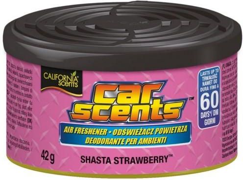 Zapach California Car Scents Shasta Strawberry 42g Produkty California Scents są znane i cenione na całym świecie, to co cechuje markę to najwyższa jakość produktów. Zapachy te produkowane są w słonecznej Kalifornii w USA, z wykorzystaniem naturalnych składników. W środku puszki znajdują się 3 bloczki wytworzone z drzewa cedrowego, które nasączone są po brzegi wyjątkowymi olejkami zapachowymi które w znakomity sposób wypełnia Twój samochód ulubionym zapachem. Bardzo estetyczny i designerski wygląd zapachu w postaci metalowej puszki z ładną etykietą perfekcyjnie wkomponuje się w każde miejsce Twojego samochodu np. pod fotel, do schowka lub miejsce na kubek. Producent zadbał jednak nie tylko o estetykę samego opakowania, ale również o możliwość regulacji intensywności zapachu. Dzięki plastikowemu otwarciu tzw. "wiatrakowy" możemy w płynny sposób dozować dawkę zapachu. Stosując zapach w temperaturze powyżej 8 stopni Celsjusza będziemy mogli cieszyć się jego największą intensywnością nawet do 60 dni. Po tym czasie należy obrócić wkład w pojemniku i umieścić go np. w szafie lub szufladzie. Dzięki temu zapach utrzyma się jeszcze przez kilka tygodni.