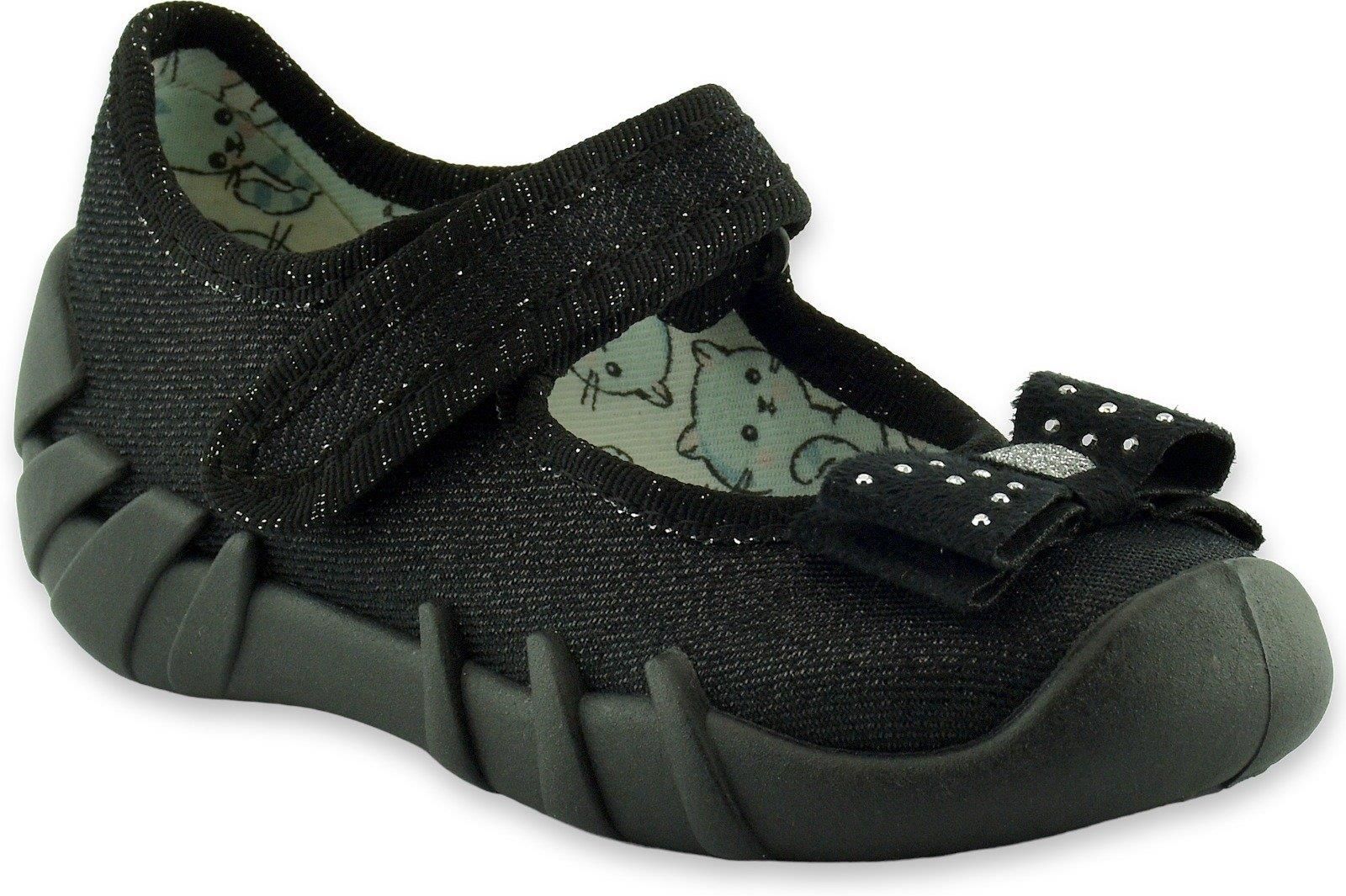 Kapcie dziecięce baleriny BEFADO 109P146 czarne Producent: Befado Model: 109P146 Materiał zewnętrzny: Tkanina Podeszwa: Oddychająca Wkładka: Tkanina Właściwości: Podwyższony zapiętek Zapięcie: Rzepy Płeć: Dziewczynka Cholewki wykonane z przewiewnych tkanin bawełnianych. Podwyższony zapiętek i …