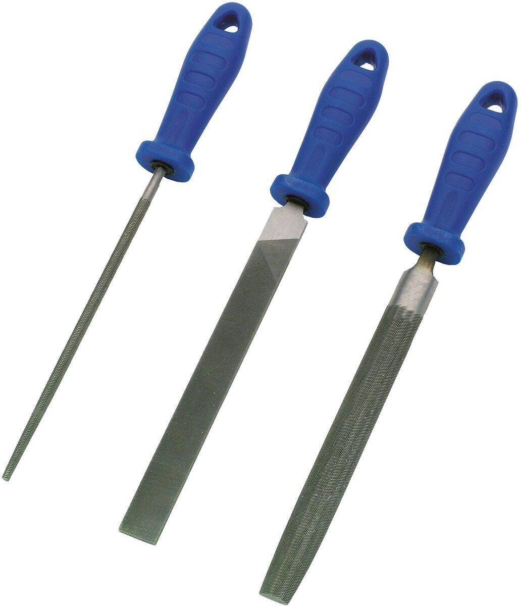 Zestaw pilników do metalu, 3-częściowy, LUX-TOOLS.Pilniki o podwójnym nacięciu, wykonane z hartowanej stali, z ergonomicznymi rękojeściami z tworzywa sztucznego. W skład kompletu wchodzą pilniki o przekroju okrągłym, płaskim i półokrągłym. Długość pilników: 200 mm.