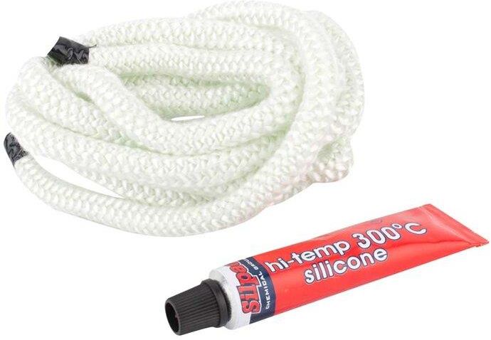 Zestaw uszczelniający firmy Prodmax. W skład zestawu wchodzą: - Sznur uszczelniający z włókna szklanego o średnicy 6 mm i długości 2,5 m. Przeznaczony jest do uszczelniania drzwiczek wkładów kominkowych, aby skutecznie zapobiegać przedostawaniu się dymu z kominka do pomieszczenia, zapewniając szczelność układu kominkowego. Elastyczny sznur wykonany z włókna szklanego z najlepszej przędzy o wytrzymałości do 650°C - Klej wysokotemperaturowy do sznura uszczelniającego. Jest to wysokiej jakości elastyczny klej na bazie silikonu. Jest odporny na wysoką i niską temperaturę od -60 st. C. do ꤤ st. C. oraz na działanie olejów, paliw i czynników agresywnych. Przeznaczony do klejenia lub uszczelniania powierzchni metalowych, szklanych, ceramicznych itp. Służy do przyklejania sznura w drzwiczkach wkładów kominkowych, zapewniając im szczelność, naprawy lub uszczelniania instalacji kominowych przyłączy pieców, instalacji C.O. i gazowych, itp. Jest łatwy w aplikacji. Pojemność: 20 ml.