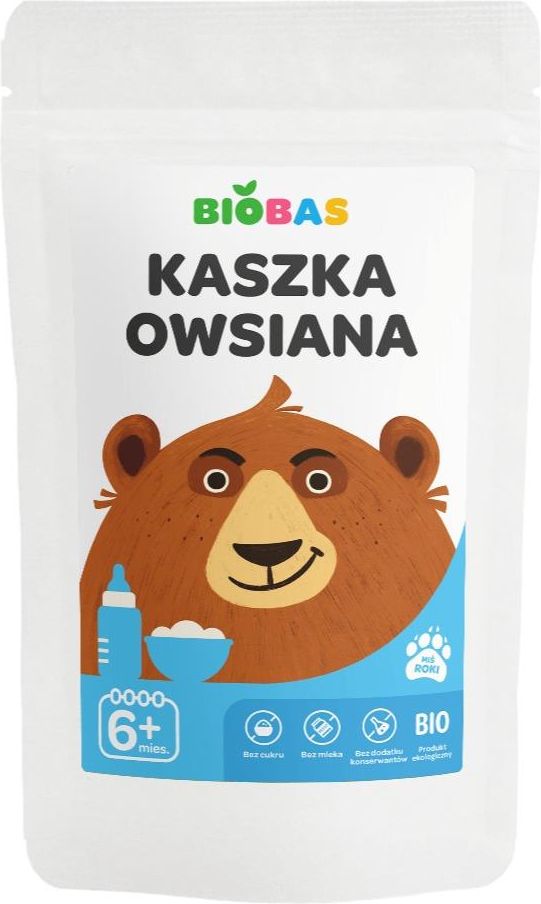 Kaszka Owsiana Bezmleczna EKOLOGICZNA Bez cukru Dla Dzieci 200g / BIOBAS Kaszka Owsiana 200g / BioBas Ekologiczna kaszka owsiana BioBas to delikatna i pożywna kaszka przygotowana z pełnoziarnistego owsa. Dzięki wysokiej wartości odżywczej i łagodnemu smakowi doskonale sprawdza się jako jedna z pierwszych kaszek w diecie niemowlęcia – już od 4/6 miesiąca życia. Owies jest ceniony za zawartość błonnika, witamin i minerałów, dlatego kaszka owsiana to nie tylko zdrowy posiłek dla najmłodszych, ale także świetna propozycja dla starszych dzieci i dorosłych. Dlaczego warto wybrać kaszkę owsianą BioBas? Ekologiczna – Seria BioBas to certyfikowane kaszki i płatki z najlepszej jakości składników ekologicznych. Źródło błonnika (beta-glukany) – wspiera trawienie i reguluje poziom cukru. Witaminy z grupy B – korzystne dla układu nerwowego i przemiany materii. Minerały (żelazo, magnez, cynk, fosfor) – wspomagają odporność, kości i mięśnie. Naturalnie sycąca – zapewnia energię na dłużej. Naturalny skład – bez cukru, konserwantów i GMO. Uniwersalna – świetna zarówno dla niemowląt, starszych dzieci, jak i dorosłych. Jak podawać kaszkę owsianą BioBas? Dla niemowląt i małych dzieci Jako pierwszą kaszkę na mleku modyfikowanym lub wodzie, Z dodatkiem musu owocowego (jabłko, banan, gruszka), W formie kremowej, lekkostrawnej papki. Dla starszych dzieci i dorosłych Jako owsianka na śniadanie z owocami i bakaliami, Baza do placuszków, ciastek czy deserów, Dodatek do zup mlecznych i koktajli. Sposób przygotowania kaszki owsianej Butelka misiowej kaszki: 2 płaskie łyżki* kaszki, 200ml mleka/wody. Miska misiowej kaszki: 4 płaskie łyżki* kaszki, 200ml mleka/wody * 1 Płaska łyżka = 8g Do zimnego mleka lub wody wsyp odpowiednią ilość kaszki. Zagotuj mieszając. Gotuj jeszcze przez 2-3 minuty, ciągle mieszając. Letnią kaszkę przelej do butelki lub miski. Starszym dzieciom możesz dodać owoce, dżem, konfiturę, masło lub czekoladę. Smacznego! Specyfikacja kaszki owsianej BioBas Składniki: kaszka owsiana* *składniki z certyfikowanych upraw ekologicznych. Na terenie zakładu produkowane są produkty zawierające gluten i soję. Wartość odżywcza w 100g kaszki owsianej Wartość energetyczna: 1580kJ / 375kcal Tłuszcz: 7,2g (w tym kwasy tłuszczowe: 1,3g) Węglowodany: 62g (w tym cukry*: 0,9g) Błonnik: 6,9g Białko: 12g Sól**: 0,01g *Bez dodatku cukrów. Zawiera naturalnie występujące cukry. **Zawartość soli wynika wyłącznie z obecności naturalnie występującego sodu. Przechowywanie produktu: Przechowywać w suchym i chłodnym miejscu. Pamiętaj o szczelnym zamknięciu opakowania. Certyfikat: PL-EKO-01 (Ekologiczne Rolnictwo UE) Kraj pochodzenia: rolnictwo UE Waga: 200g Producent Naturo Sp. z o. o. Elizówka, ul. Szafranowa 6 Hala H1 21-003 Ciecierzyn Daty przydatności serii BIOBAS Kaszka Manna 04.11.2025 Kaszka Owsiana 25.08.2026 Kaszka Orkiszowa 22.10.2025 Kaszka Gryczana 14.01.2026 Kaszka Jaglana 17.12.2025 Kaszka Ryżowa 04.02.2026 Płatki Orkiszowe 06.06.2026 Płatki Gryczane 14.11.2025 Płatki Owsiane 06.04.2026 Płatki Jaglane 17.12.2025