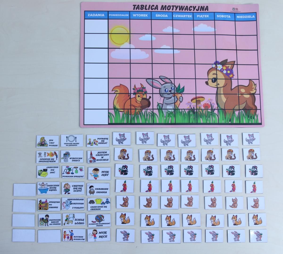 Magnetyczna tablica motywacyjna Tęczowa Kraina - duża wersja A3Nasza magnetyczna tablica motywacyjna wykonanana folii magnetyczne , dodatkowo jest zabezpieczona laminatem przed zabrudzeniem. Elementy trzymają się na planszy nawet wtedy, gdy nie jest ona zaczepiona na tablicy magnetycznej. Magnetyczna tablica motywacyjna- tęczowa kraina to świetny sposób na zapoznanie się z codziennymi zasadami i obowiązkami panującymi w domu i w środowisku,Głównym celem jest motywowanie dziecka to podejmowania pożądanych działań, oraz wprowadzenie w świat konsekwencji i nagród.Tablica motywacyjna w całości została wykonana z foli magnetycznej, dodatkowo tylko u nas wzmocniona laminatem na zewnątrz, co nadaje jej błysk, jak również pełni funkcję ochronną, tak aby łatwo można było ją przetrzeć, gdy zajdzie taka potrzeba. Wymiar tablicy to 30 cm X 40 cm.Jak korzystać z Tablicy motywacyjnej?1. Znajdź odpowiednie miejsce – lodówka, tablica magnetyczna.2. Wraz z dzieckiem omów obrazki, na których są poszczególne zadania ( obowiązki domowe) do WYBORU TYLKO U NAS 20 ZADAŃ + 5 WOLNYCH MAGNESÓW NA WŁASNE ZADANIA, a następnie każdego dnia wybierajcie jakie zadania będą do wykonania.3. Na tablicy znajdują się odpowiednie miejsca na zamieszczanie poszczególnych magnesów obrazków. Z lewej strony, widnieje kolumna ZADANIA – tutaj zaczepiamy magnetyczne obrazki dotyczące obowiązków domowych w danym dniu.4. W pozostałych kolumnach w każdym dniu tygodnia udzielamy, za dobrze wykonaną czynność magnesów z nagrodami.Aby wzmocnić pozytywne zachowania, możemy zastosować strategię nagród pod koniec dnia oraz tygodnia, gdy cała tablica będzie zapełniona znaczkami, nagrodą może być wyjście na basen, wspólny wyjazd, coś co sprawia dziecku satysfakcję.Tablica motywacyjna została opracowana przez pedagoga specjalnego z wieloletnim stażem pracy z myślą o dzieciach : - w celach motywacyjnych- sprawiających trudności wychowawcze- z zaburzeniami rozwojowymi: zespół Aspergera, autyzm- z zaburzeniami zachowania : ADHD, zaburzenia emocjonalne, Zawartość zestawu:- 1 Magnetyczna tablica motywacyjna - tęczowa kraina w formacie A3 (30 cm/ 40 cm) na grubej folii magnetycznej – dodatkowo zabezpieczona laminatem- 20 szt. magnesów zadań do wykonywania (również zabezpieczonych laminatem) : zarówno dla dzieci młodszych jak i starszych (od prostych do trudniejszych) dwa poziomy obowiązków Zadania: ,,pomagam sprzątać, myję zęby, sprzątam po zabawie, myję ręce, grzecznie się ubieram, odrabiam zadania, jem cały posiłek, grzecznie idę spać, ścielę łóżko, słucham rodziców, grzecznie biorę kąpięl, opiekuję się zwierzątkiem, potrafię się dzielić, chętnie idę się uczyć, jestem grzeczny w kościele, samodzielnie korzystam z toalety, wyrzucam śmieci, przynoszę rzeczy do prania, odnoszę talerz po jedzeniu, pomagam rozwieszać pranie" - 5 szt. magnesów pustych do dowolnego uzupełniania (również zabezpieczonych laminatem) - 49 szt. magnesów motywacyjnych ( związane ze światem zwierząt) (wystarczy na uzupełnienie całej tygodniowej tablicy) ( również zabezpieczonych laminatem) Tablica wykonywana na trwałej folii magnetycznej, solidnie trzymającej się na lodówkach, tablicach magnetycznych wraz z wszystkimi elementami.
