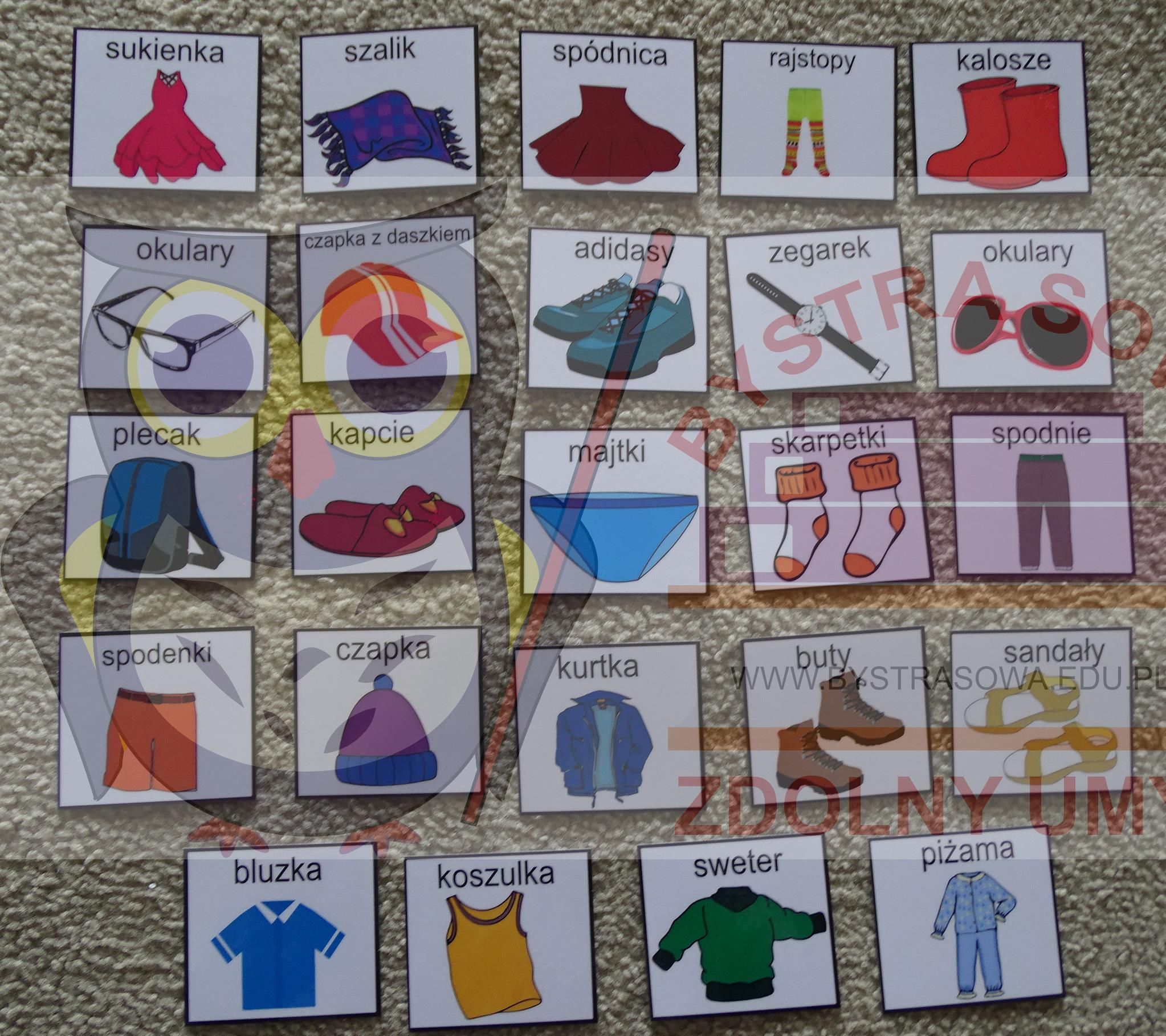 Zestaw służy do komunikacji wspomagającej i alternatywnej. W zestawie mamy 24 szt. zalaminowanych obrazków dotyczących ubrań i różnych akcesorii. Obrazki w formie zalaminowanej w zestawie: (ROZMIAR POJEDYNCZEGO OBRAZKA 6 CMX 5 CM) 1. majtki 2. skarpetki 3. spodnie 4. spodenki 5. bluzka 6. koszulka 7. swetr 8. piżama 9. czapka 10.kurtka 11.buty 12.sandały 13.sukienka 14.szalik 15.spódnica 16.rajstopy 17.kalosze 18.kapcie 19.czapka z daszkiem 20.adidasy 21.zegarek 22.plecak 23.okulary 24.okulary przeciwsłoneczne Istnieje możliwość do obrazków dokupienia również 3 szt. kart aktywności w formie zalaminowanej (format A4 każda karta, druk jednostronny), by móc stworzyć własną książkę PECS. WYBIERZ OPCJĘ - Z KARTAMI AKTYWNOŚCI.