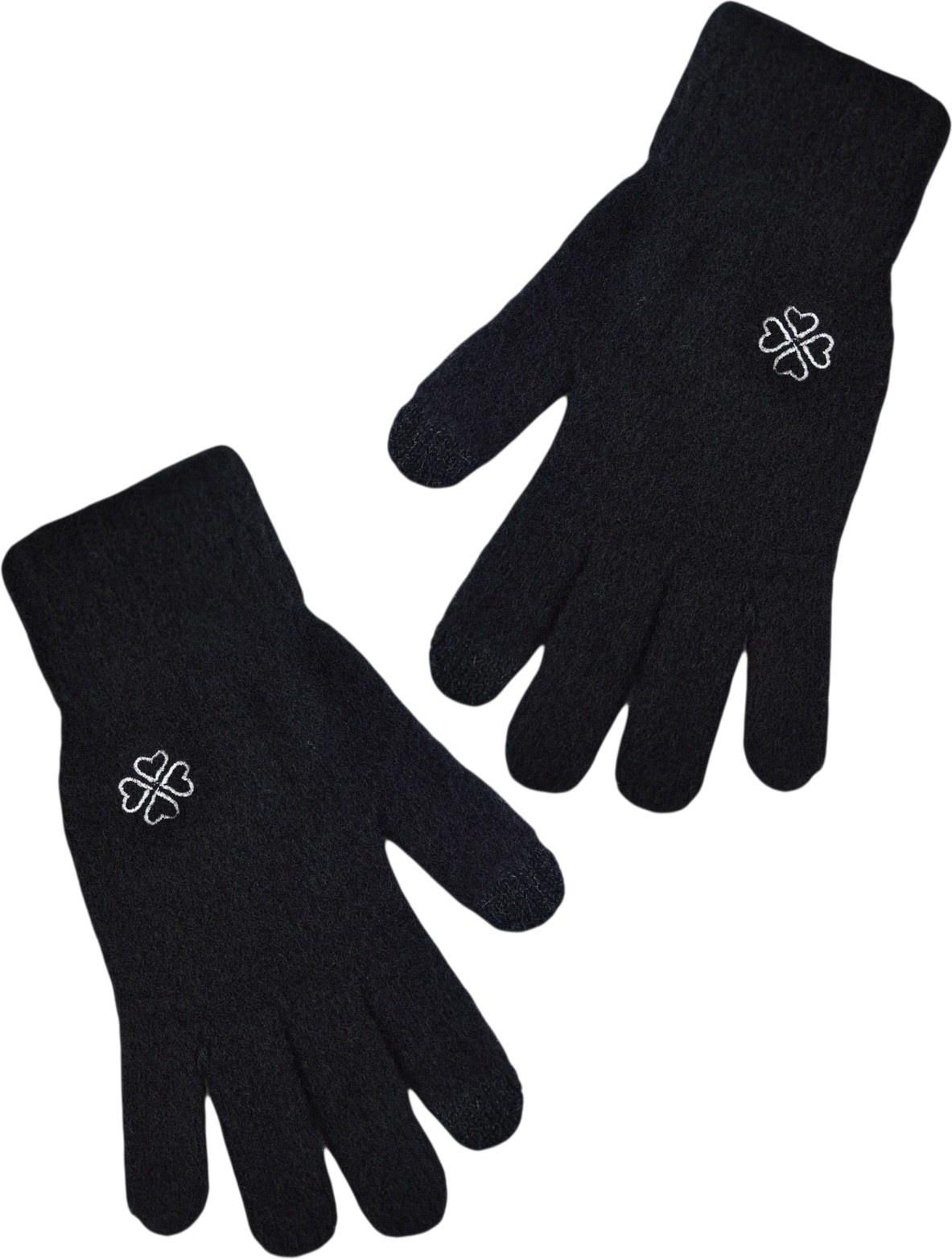 Czarne rękawiczki dziewczęce, miękkie i przyjemne w dotyku, ozdobione delikatnym srebrnym wzorem. Wyposażone w specjalny materiał na kciuku i palcu wskazującym, obsługę ekranów dotykowych. Skład: - 82% Poliamid, - 17% Poliester, - 1% Elastan
