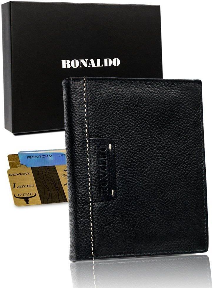Duży skórzany czarny portfel męski RFID — Ronaldo Praktyczny portfel męski marki Ronaldo. Wersja pionowa bez zapięcia. Portfel wykonany z całości ze skóry naturalnej dobrej jakości. Zapakowany w eleganckie pudełko - doskonały na prezent. Portfel wyposażony w: Ilość kieszeni na monety: 1 Ilość kieszeni na banknoty: 2 Ilość miejsc na karty: 10 Ilość miejsc na dokumenty : 4 Miejsce na fotografię: 1