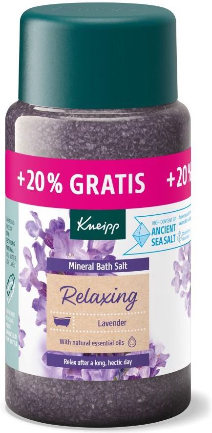 KNEIPP RELAXING Sól do kąpieli, 600g Kryształki do kąpieli z soli mineralnej Relaxing Lawenda Kryształki do kąpieli Relaxing Kneipp® z naturalnym eterycznym olejkiem lawendowym sprawią, że ciepła kąpiel będzie prawdziwym relaksem i odprężeniem. Subtelny zapach lawendy, odżywcza moc soli termalnej dadzą ukojenie dla ciała i zmysłów po wymagającym dniu.Jak używać sól Relaxing? Wsypać kryształki do nakrętki (3/4), dodać do wanny z ciepłą wodą o temperaturze ok. 36-38°C i rozpuścić je całkowicie. Optymalny czas kąpieli: 15-20 minut. Przechowywać w miejscu niedostępnym dla dzieci, nie pić, nie połykać. Chronić przed wrażliwymi powierzchniami w łazience. Produkt kosmetyczny, tylko do użytku zewnętrznego. Jakie składniki posiada sól Relaxing? Sodium Chloride, Polysorbate 20, Linalool, Parfum (Fragrance), Lavandula Angustifolia (Lavender) Oil, Lavandula Hybrida Oil, Lavandula Angustifolia (Lavender) Extract, Lavandula Latifolia (Lavender) Oil, Lavandula Hybrida Extract, Camphor, Limonene, Sodium Carbonate, Sodium Methyl Oleoyl Taurate, Aqua (Water), Tocopherol, CI 28440. Środki ostrożności Optymalny czas kąpieli: 15-20 minut. Przechowywać w miejscu niedostępnym dla dzieci, nie pić, nie połykać. Chronić przed wrażliwymi powierzchniami w łazience. Produkt kosmetyczny, tylko do użytku zewnętrznego.