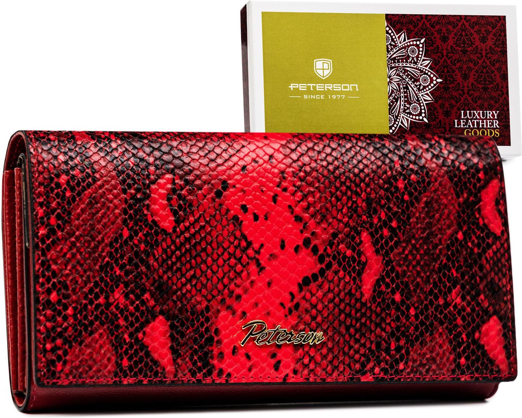 Duży portfel damski z podwójną sekcją na bilon - PetersonDUŻY PORTFEL DAMSKI Z PODWÓJNĄ SEKCJĄ NA BILON - PETERSONPTN SM-411-0704 RED590305119070497651145 Duży portfel damski z podwójną sekcją na bilon — Peterson Renomowana marka | Produkt znanej i cenionej polskiej marki z wieloletnią tradycją. Wysoka jakość | Odszyty bardzo trwale z doskonałej jakości skóry naturalnej. Wykorzystanie starannie wyselekcjonowanych materiałów jest gwarancją długiego użytkowania. Rewelacyjny design | Portfel o klasycznym fasonie i najmodniejszym wzorze skóry węża. Model w orientacji poziomej zapinany klapką na zatrzask. Z szeregiem przegródek | Dodatek idealny dla Kobiet, które posiadają niezliczone ilości kart, wizytówek i dokumentów! Postaw na funkcjonalny portfel! Bezpieczny | Wyposażony w technologię RFID BLOCKING SYSTEM, która zabezpiecza karty zbliżeniowe, dokumenty biometryczne, legitymacje i karty komunikacji miejskiej przed nieautoryzowanym odczytem danych. Modny zwierzęcy wzór Portfel damski zachwycający swoim designem. Wężowa skóra to hit tego sezonu! Niezwykle efektowny i kobiecy wzór, który wspaniale ożywi Twoje stylizacje i nada im charakterystycznego pazura. Prezentowany portfel wykończono złotym logo, które nadaje mu luksusowego wyglądu. Z takim dodatkiem nie przejdziesz niezauważona! Uporządkuj swoje karty i dokumenty Portfel zapinany jest na wyjątkowo mocny zatrzask, ukryty pod klapą. Wewnętrzna część jest niezwykle pojemna, bo kryje w sobie mnóstwo kieszonek i przegródek. Już nigdy nie zabraknie Ci miejsca do schowania kart lojalnościowych, dokumentów czy zdjęć rodziny Wewnątrz znajdziesz: 2 schowki na duże dokumenty. Jeden ze schowków mieści się po zewnętrznej stronie portfela, z tyłu; 5 miejsc na karty płatnicze, wizytówki i dokumenty o standardowym formacie. Jedna z przegródek jest przezroczysta i świetnie nada się na fotografię. Sekcje na pieniądze na bilon przeznaczone są 2 kieszenie - jedna zamykana suwaczkiem, druga klapką na zatrzask na banknoty wydzielone są kolejne 3 szerokie przegródki, idealne dla osób używających kilku walut. Fotografie bliskich zawsze pod ręką Przegródka na fotografię nie przypadkowo umiejscowiona jest w pierwszej części portfela. Przecież to jasne, że możliwość spojrzenia na ukochaną osobę w każdej chwili może poprawić Ci humor! https://rovicky.eu/data/gfx/pictures/large/1/7/22071_5_1.jpg