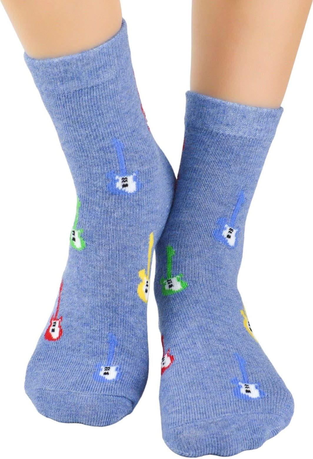 Niebieskie skarpetki dla chłopca z gitarami. Delikatny wzorek dodaje uroku. Idealnie dopasowują się do nogi. Doskonałe na każdą porę roku i do każdego obuwia. Skład: -70% bawełna -25% poliamid - 5% elastan
