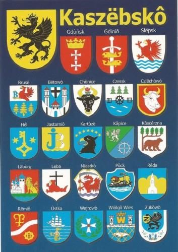 Pocztówka Kaszëbskô – Herby miast kaszubskich Widokówka prezentująca herby miast Kaszub. Ciekawa pamiątka z wakacji na Kaszubach. Na pocztówce umieszczone są dwadzieścia trzy herby kaszubskich miast między innymi: Gdańska, Gdyni, Słupska, Helu, Kartuz, Kościerzyny, Ustki. Wielkość: 10,5 x 15 cm Wyprodukowano na Pomorzu.