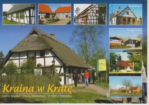 Pocztówka Kraina w Kratę Zdjęcia pomorskich checzy o charakterystycznym szachulcu. Swołowo to wieś położona około 15 km na północny zachód od Słupska, przy trasie Słupsk - Darłowo, z zachowanymi elementami średniowiecznych form zabudowy. Jest to jedna z najciekawszych historycznie wsi na Pomorzu, uznana za Europejską Wieś Dziedzictwa Kulturowego i stolicę „Krainy w Kratę”. Znajdują się tu zachowane obiekty budownictwa szkieletowego z początków XIX wieku typowego dla bogatych pomorskich zagród chłopskich. Wspaniała pamiątka ze zwiedzania tego urokliwego miejsca - dawnej pomorskiej wsi. Wielkość 10,5 x 15 cm Wyprodukowano na Pomorzu.