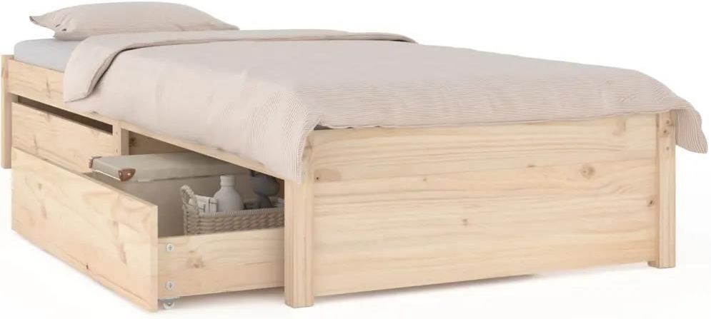 Charakteryzująca się prostym, a zarazem ponadczasowym wzornictwem, wykonana z drewna rama łóżka będzie bardzo praktycznym i ozdobnym dodatkiem do Twojej sypialni. Lite drewno sosnowe: lite drewno to piękny, naturalny materiał. Drewno sosnowe ma prostą strukturę słojów, a sęki nadają mu wyjątkowy, rustykalny wygląd. Solidne listwy: wykonane ze sklejki listwy zapewniają dobre rozłożenie ciężaru, dzięki czemu materac pozostaje na swoim miejscu przy każdym skręcie i obrocie ciała podczas snu. Funkcja przechowywania: dołączone szuflady łóżka oferują dużo miejsca do przechowywania niezbędnych rzeczy, utrzymując pokój w czystości i porządku. Uwaga: Dostawa zawiera tylko ramę łóżka. Materac nie znajduje się w przesyłce Pasujący materac można znaleźć w naszym sklepie. Do ramy łóżka pasują materace o wymiarach 100 x 200 cm Materiał wykonania ramy: lite drewno sosnowe (surowe) Materiał wykonania listew: sklejka Wymiary: 205,5 x 105,5 x 31 cm (dł. x szer. x wys.) Wymiary szuflady: 103 x 95 x 18 cm (szer. x gł. x wys.) Wymiary pasującego materaca: 100 x 200 cm (szer. x dł.); materac nie jest częścią paczki Wymagany montaż: tak Zawartość paczki: 1 x rama łóżka 2 x szuflada pod łóżko