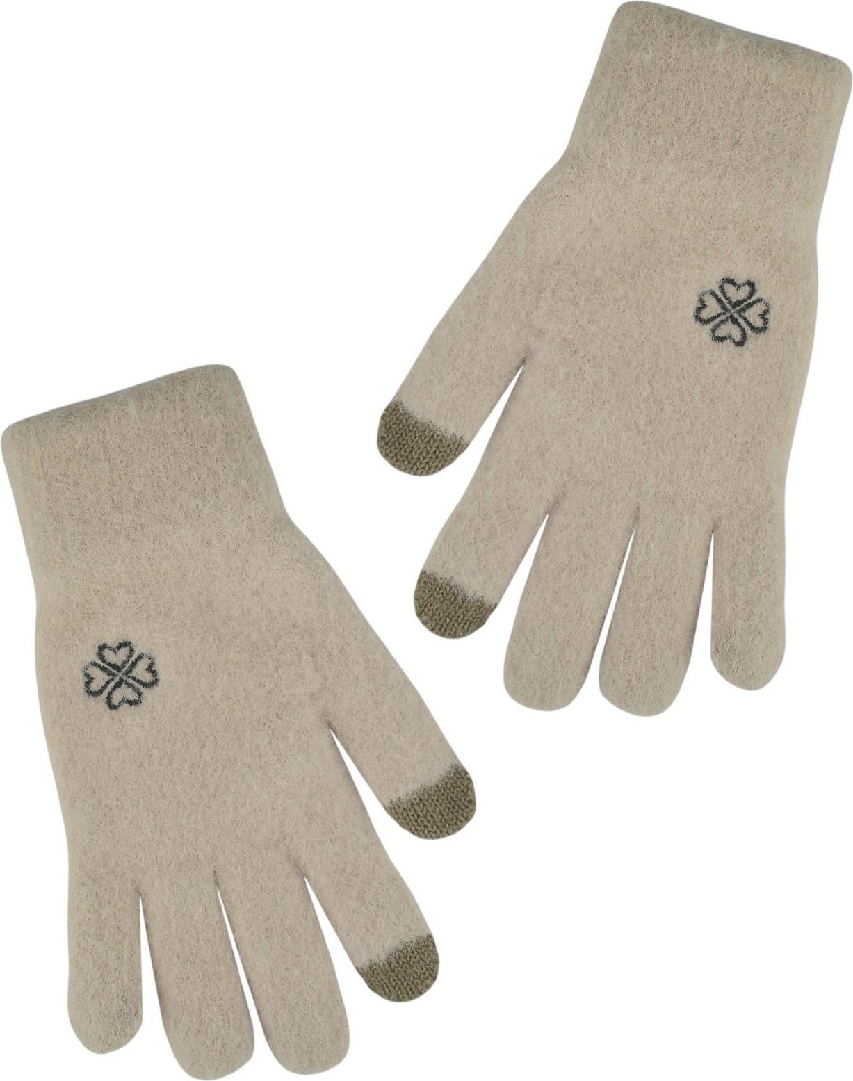 Beżowe rękawiczki dziewczęce z delikatnym srebrnym wzorem. Miękkie, wygodne i wyposażone w specjalny materiał na kciuku i palcu wskazującym, ułatwiający obsługę ekranów dotykowych. Skład: - 82% Poliamid, - 17% Poliester, - 1% Elastan,