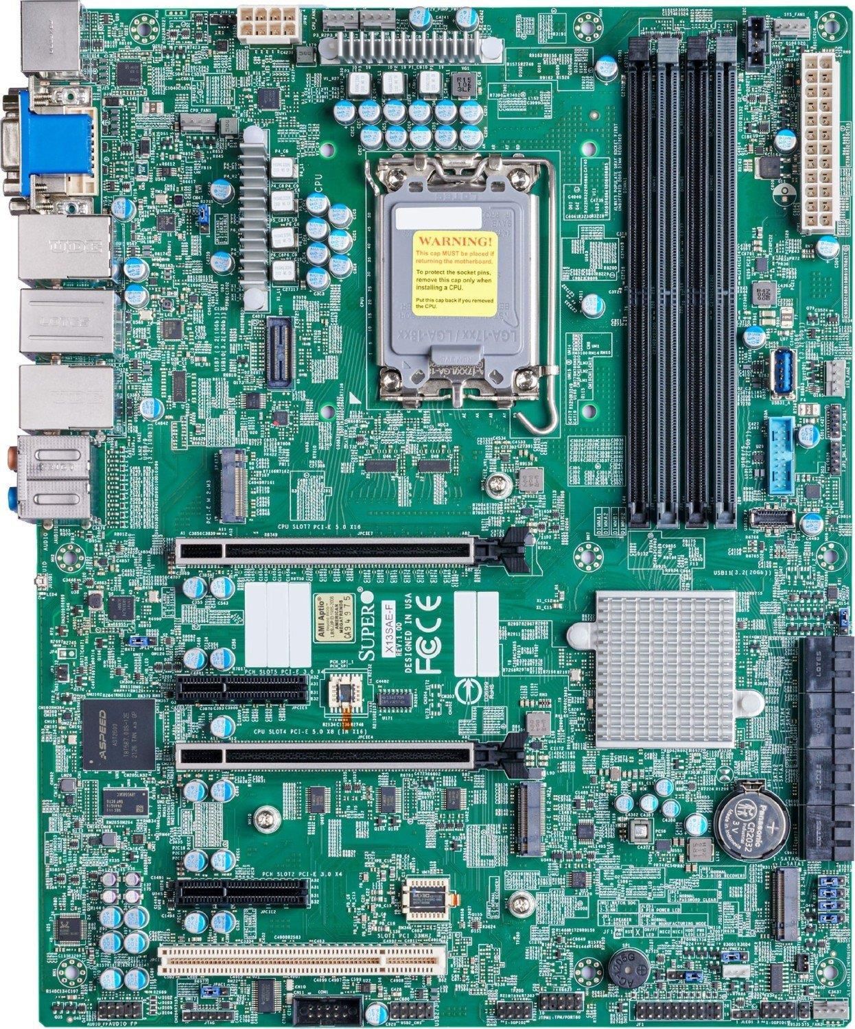 Supermicro MBD-X13SAE-F. Producent procesora: Intel, Gniazdo procesora: LGA 1700, Procesor: Intel® Core™ i3, Intel® Core™ i5, Intel® Core™ i7, Intel® Core™ i9. Obsługiwane rodzaje pamięci: DDR5-SDRAM, Maksymalna pojemność pamięci: 192 GB, Typ slotów pamięci: DIMM. Wspierane interfejsy dysków twardych: M.2, PCI Express 3.0, PCI Express 5.0, Poziomy raid: 0, 1, 5, 10. Wersja HDMI: 2.0b, Wersja DisplayPort: 1.4a. Rodzaj interfejsu sieci Ethernet: 2.5 Gigabit Ethernet, Kontroler LAN: Intel® I219-LM