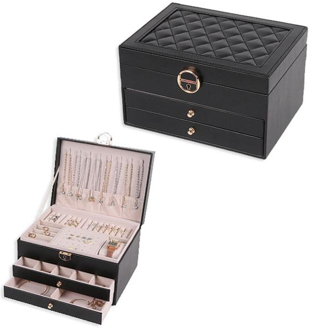POJEMNA SZKATUŁKA NA BIŻUTERIĘ Szkatułkę charakteryzuje elegancka, subtelna oprawa, wykonana z dbałością o każdy najdrobniejszy detal. Jej styl wpasuje się idealnie w wystrój każdego wnętrza, będzie pięknie prezentować się na toaletce, stoliku, w sypialni, na komodzie, w garderobie, czy też w dziecięcym pokoju. Specyfikacja Kolor: czarny Wysokość: 13,5 cm Szerokość: 23 cm Głębokość: 17 cm Materiał: skóra ekologiczna Kluczyk w zestawie Po otrzymaniu produktu z względu na specyfikę materiału, radzimy przetrzeć obudowę i szufladki wilgotną szmatką. ORGANIZACJA BIŻUTERII - kuferek na biżuterię umożliwia skuteczną organizację Twojej kolekcji. Posiada różne rozmiary przegródek i kieszeni, które ułatwiają przechowywanie wszystkich rodzajów biżuterii, takich jak pierścionki, naszyjniki, bransoletki, zegarki czy kolczyki. Dzięki temu możesz łatwo znaleźć i wybrać odpowiednią biżuterię do noszenia. ZAMYKANY NA KLUCZ – dzięki dołączonemu kluczykowi zyskujesz pewność, że nikt oprócz Ciebie nie korzysta z kuferka, nie ogląda i nie pożycza biżuterii. To dodatkowa ochrona wartościowych przedmiotów. KUFEREK JEST ELEGANCKI I POJEMNY – ponadczasowy wzór, ładny kształt i srebrne elementy wykończenia dodają klasy kuferkowi, estetycznego oraz atrakcyjnego wyglądu. Dodatkowo kuferek jest pojemny, zmieścisz w nim wszystkie Swoje błyskotki. Nie czekaj, kup już dziś! To nie tylko szkatułka na biżuterię, to również doskonały prezent dla Ciebie samej lub dla bliskiej Ci osoby. Wywołaj radość i zachwyt na twarzy swojej przyjaciółki, siostry lub mamy, obdarowując je tym pięknym i funkcjonalnym akcesorium.