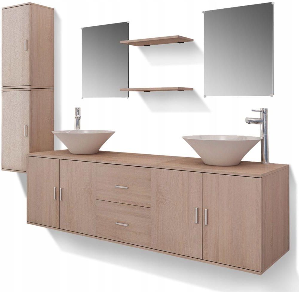 vidaXL 11-cz. zestaw do łazienki z umywalkami i kr vidaXL Ten kompletny zestaw, składający się z 1 szafki pod umywalkę montowanej na ścianie, 2 szafek montowanych na ścianie, 2 luster, 2 półek oraz 2 umywalek oraz 2 kranów, będzie znakomitym dodatkiem do Twojej łazienki, optymalnie wykorzystującym jej przestrzeń bez konieczności rezygnowania ze stylu. Szafki wiszące i szafka pod umywalkę z dwiema szufladami zapewniają dużo miejsca do przechowywania przyborów toaletowych, akcesoriów i różnego rodzaju mniejszych przedmiotów. Grzebienie, kosmetyki, szczoteczki i pasty do zębów można wygodnie uporządkować na półkach w zasięgu ręki. Wykonana z wysokiej jakości materiału drewnopochodnego szafka podumywalkowa jest bardzo wytrzymała i trwała. Umywalki wykonane zostały z wysokiej jakości ceramiki, odpornej na zadrapania, korozję oraz łatwą do wyczyszczenia. Są odpowiednie do zamontowania nad blatem szafki. Do zestawu dołączone są 2 wysokiej jakości baterie mieszające, każda dostarczana z wężami do ciepłej i zimnej wody oraz częściami instalacyjnymi, które są łatwe w montażu. Dzięki chromowanej powierzchni, te baterie umywalkowe mają odblaskowy, lustrzany połysk, a solidna mosiężna konstrukcja, cynkowy uchwyt i ceramiczny wkład sprawiają, że baterie są bardzo trwałe. Montaż jest naprawdę łatwy. Uwaga: otwory na baterie nie są nawiercone. Kolor: Array Rozmiar: Array Ten kompletny zestaw, składający się z 1 szafki pod umywalkę montowanej na ścianie, 2 szafek montowanych na ścianie, 2 luster, 2 półek oraz 2 umywalek oraz 2 kranów, będzie znakomitym dodatkiem do Twojej łazienki, optymalnie wykorzystującym jej przestrzeń bez konieczności rezygnowania ze stylu. Szafki wiszące i szafka pod umywalkę z dwiema szufladami zapewniają dużo miejsca do przechowywania przyborów toaletowych, akcesoriów i różnego rodzaju mniejszych przedmiotów. Grzebienie, kosmetyki, szczoteczki i pasty do zębów można wygodnie uporządkować na półkach w zasięgu ręki. Wykonana z wysokiej jakości materiału drewnopochodnego szafka podumywalkowa jest bardzo wytrzymała i trwała. Umywalki wykonane zostały z wysokiej jakości ceramiki, odpornej na zadrapania, korozję oraz łatwą do wyczyszczenia. Są odpowiednie do zamontowania nad blatem szafki. Do zestawu dołączone są 2 wysokiej jakości baterie mieszające, każda dostarczana z wężami do ciepłej i zimnej wody oraz częściami instalacyjnymi, które są łatwe w montażu. Dzięki chromowanej powierzchni, te baterie umywalkowe mają odblaskowy, lustrzany połysk, a solidna mosiężna konstrukcja, cynkowy uchwyt i ceramiczny wkład sprawiają, że baterie są bardzo trwałe. Montaż jest naprawdę łatwy. Uwaga: otwory na baterie nie są nawiercone. Szafka podumywalkowa : Kolor: beżowy Materiał: materiał drewnopochodny Wymiary szafki pod umywalkę: 150 x 45 x 45 cm (dł. x szer. x wys.) Wymiary wysokiej szafki: 30 x 25 x 120 cm (dł. x szer. x wys.) Wymiary lustra: 50 x 40 mm (dł. x wys.) Wymiary półki: 40 x 20 cm (dł. x szer.) Umywalka : Kolor: biały Materiał: ceramika Wymiary: 420 x 140 mm (śr. x wys.) Typ montażu: na blacie Bateria: Kolor: srebrny Materiał: mosiężny korpus i cynkowy uchwyt Wykończenie: chromowane Wysokość całkowita wynosi 30 cm Głowica ceramiczna zapewnia trwałość Jednouchwytowa, jednootworowa bateria mieszająca Do zimnej i gorącej wody Odpowiednia do standardowego ciśnienia wody w budynkach mieszkalnych Zawartość dostawy: 1 x szafka pod umywalkę do montażu na ścianie 2 x szafka wisząca 2 x lustro 2 x półka 2 x umywalka 2 x bateria 4 x wąż elastyczny ze stali nierdzewnej 3/8", 40 cm 2 x korek klik-klak Akcesoria montażowe i instalacyjne Kolor: Array Rozmiar: Array vidaXL
